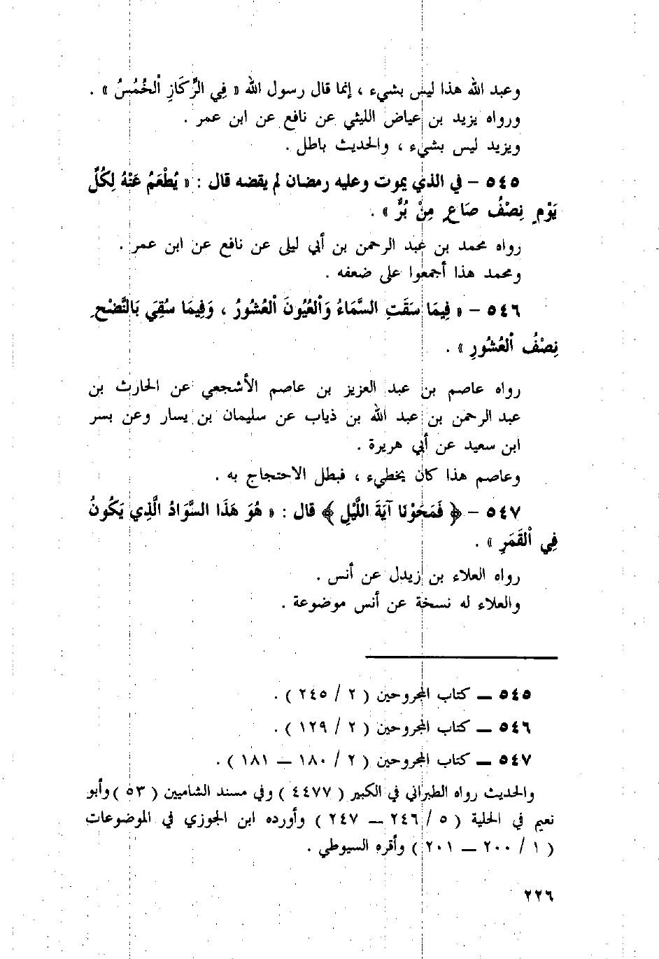 546 - «فِيمَا سَقَتِ السَّمَاءُ وَالْعُيُونُ الْعُشُورُ، وَفِيمَا سُقِيَ بِالنَّضْحِ نِصْفُ الْعُشُورِ» .