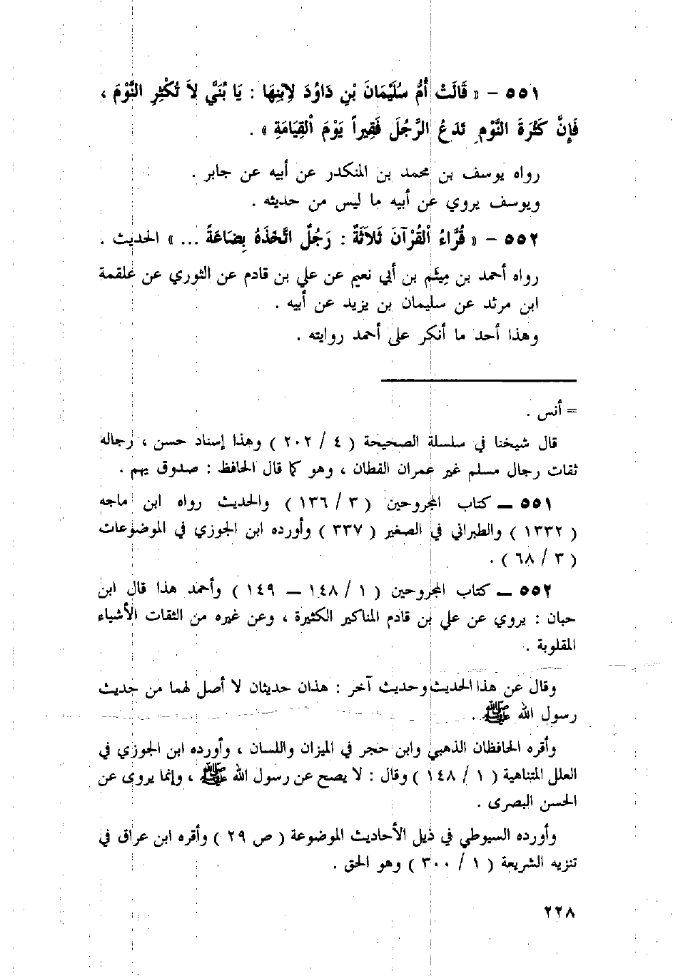 551 - " قَالَتْ أُمُّ سُلَيْمَانَ بْنِ دَاوُدَ لابْنِهَا: يَا بُنَيَّ لا تُكْثِرِ النَّوْمَ، فَإِنَّ كَثْرَةَ النَّوْمِ تَدَعُ الرَّجُلَ فَقِيرًا يَوْمَ الْقِيَامَةِ ".