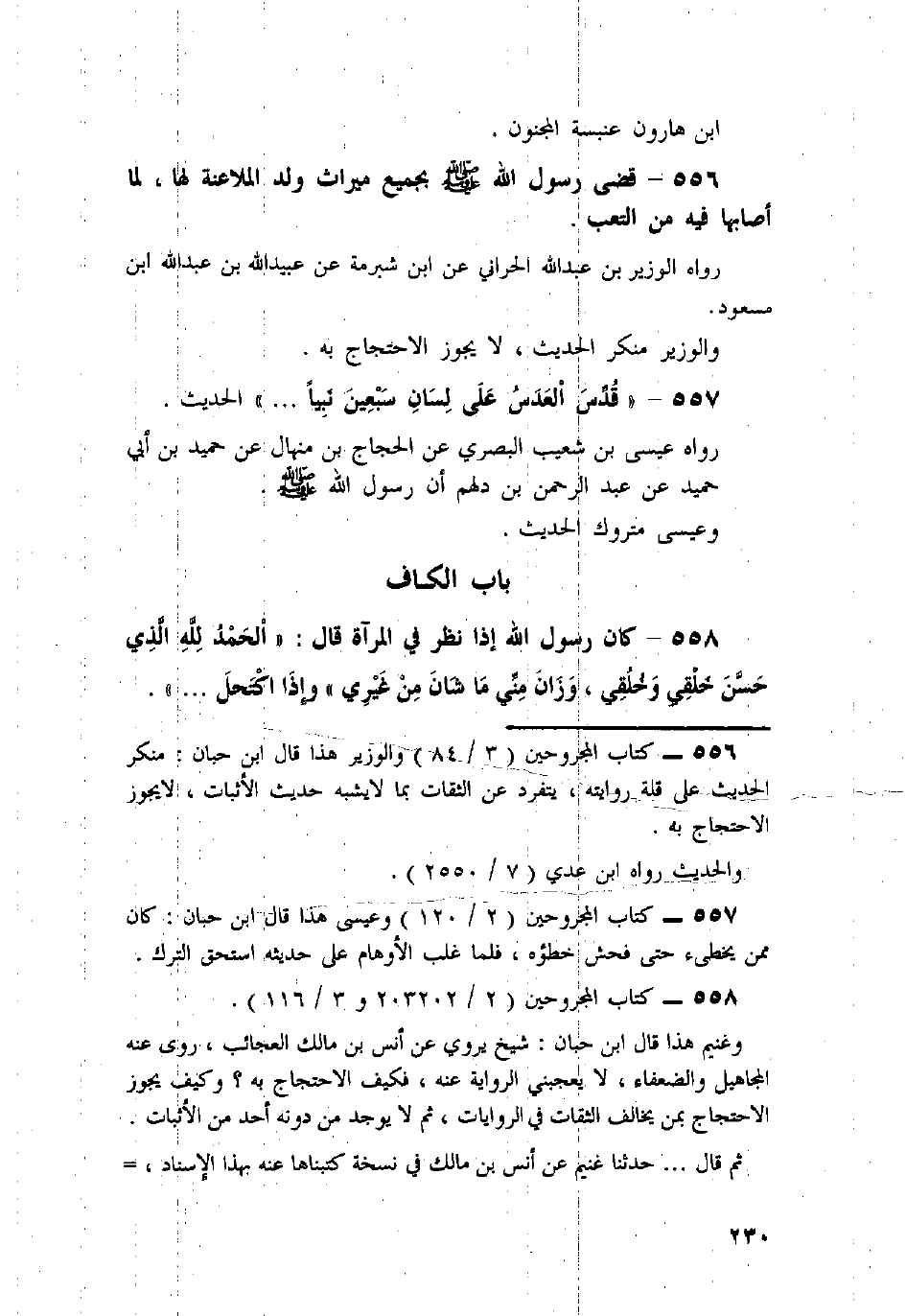 556 - «قَضَى رَسُولُ اللَّهِ صَلَّى اللَّهُ عَلَيْهِ وَسَلَّمَ بِجَمِيعِ مِيرَاثِ وَلَدِ الْمُلاعَنَةِ لَهَا، لِمَا أَصَابَهَا فِيهِ مِنَ التَّعَبِ» .