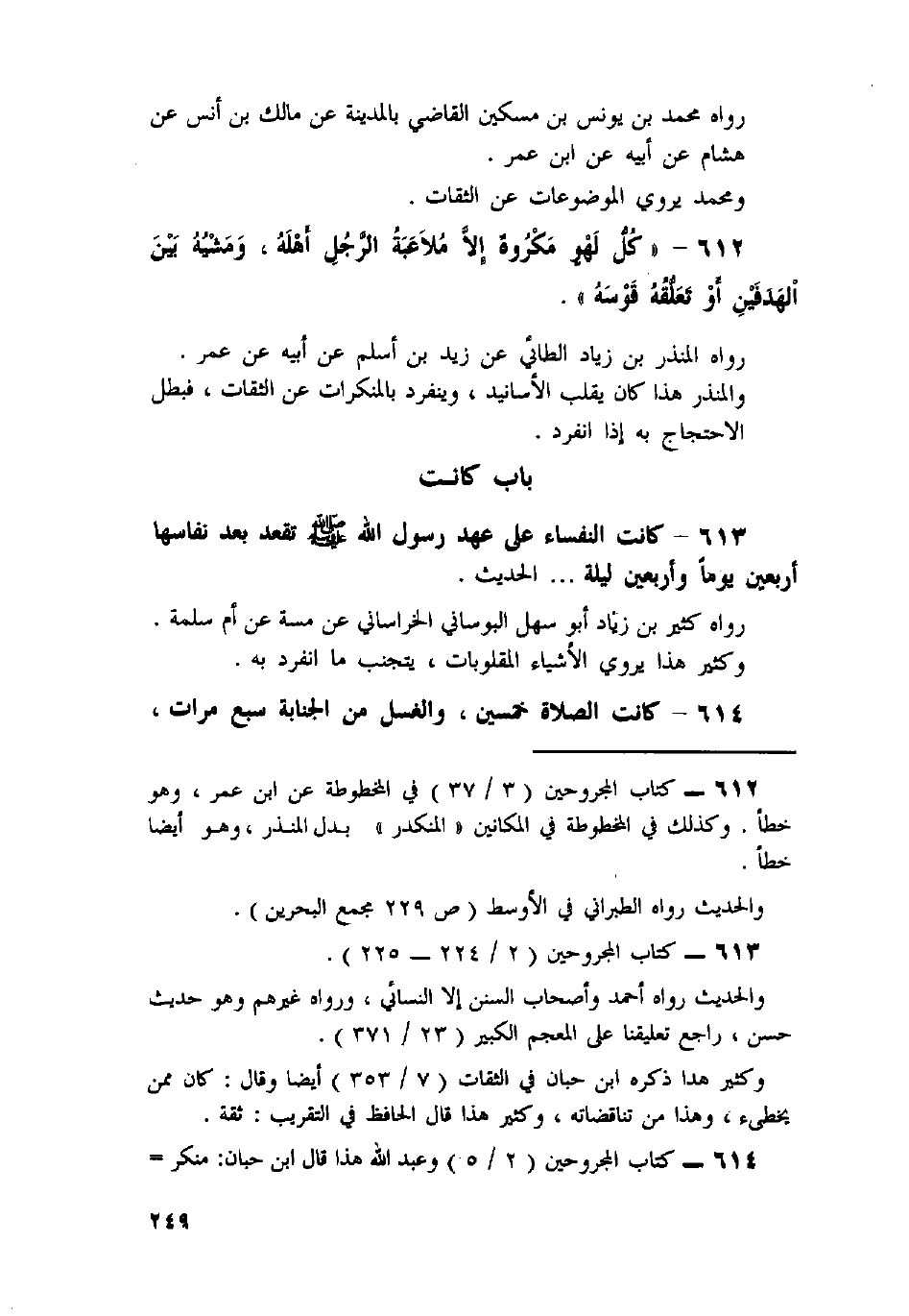 613 - كَانَتِ النُّفَسَاءُ عَلَى عَهْدِ رَسُولِ اللَّهِ صَلَّى اللَّهُ عَلَيْهِ وَسَلَّمَ تَقْعُدُ بَعْدَ نُفَاسِهَا أَرْبَعِينَ يَوْمًا وَأَرْبَعِينَ لَيْلَةً. . . الْحَدِيثَ.