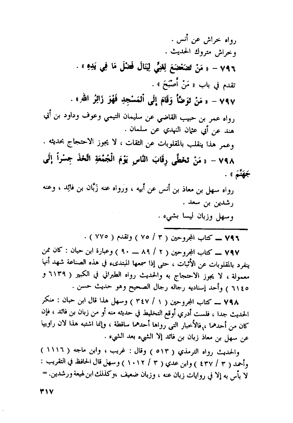 798 - «مَنْ تَخَطَّى رِقَابَ النَّاسِ يَوْمَ الْجُمُعَةِ اتَّخَذَ جِسْرًا إِلَى جَهَنَّمَ» .