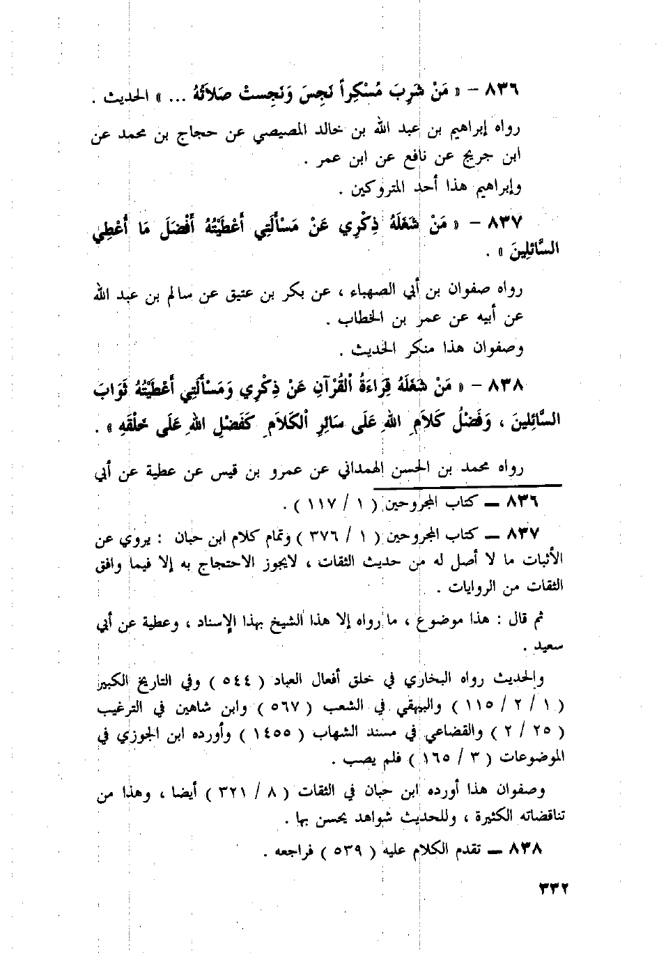 838 - «مَنْ شَغَلَهُ قِرَاءَةُ الْقُرْآنِ عَنْ ذِكْرِي وَمَسْأَلَتِي أَعْطَيْتُهُ ثَوَابَ السَّائِلِينَ، وَفَضْلُ كَلامِ اللَّهِ عَلَى سَائِرِ الْكَلامِ كَفَضْلِ اللَّهِ عَلَى خَلْقِهِ» .