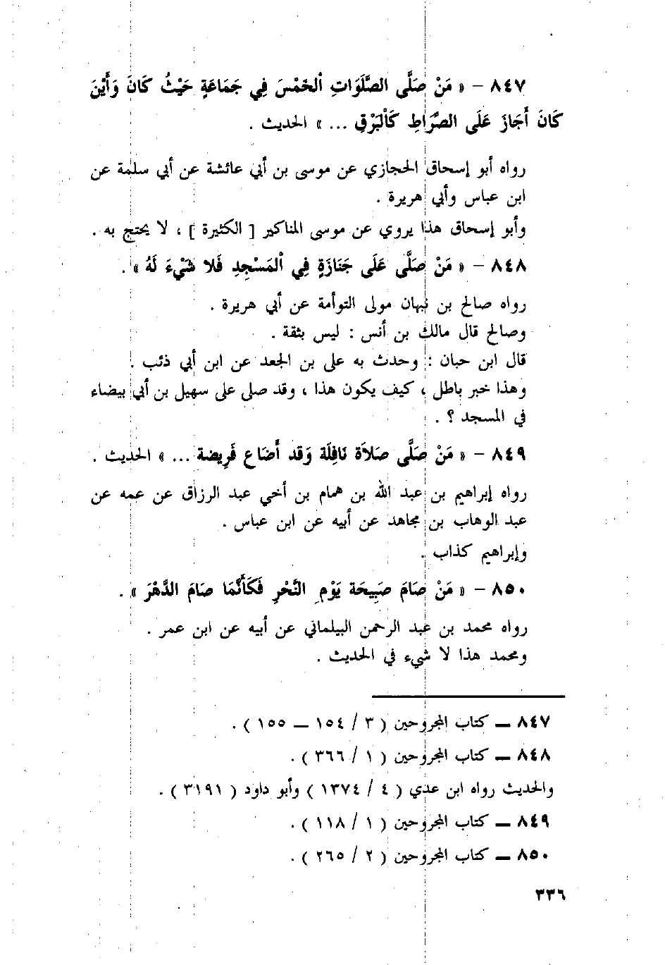 847 - «مَنْ صَلَّى الصَّلَوَاتِ الْخَمْسَ فِي جَمَاعَةٍ حَيْثُ كَانَ وَأَيْنَ كَانَ أَجَازَ عَلَى الصِّرَاطِ كَالْبَرْقِ. . .» الْحَدِيثَ.