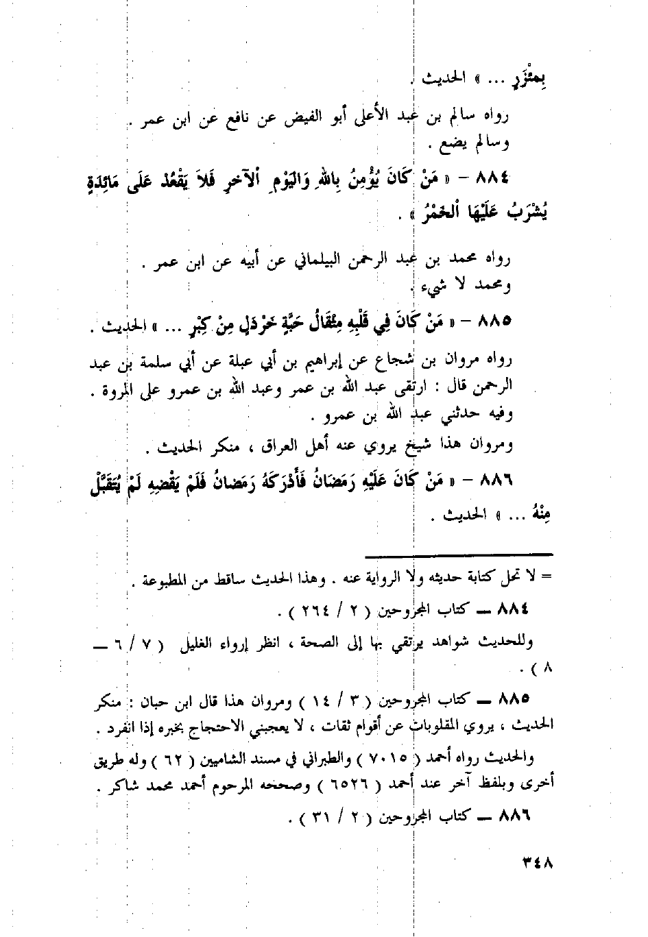 884 - «مَنْ كَانَ يُؤْمِنُ بِاللَّهِ وَالْيَوْمِ الآخِرِ فَلا يَقْعُدِ عَلَى مَائِدَةٍ يُشْرَبُ عَلَيْهَا الْخَمْرُ» .