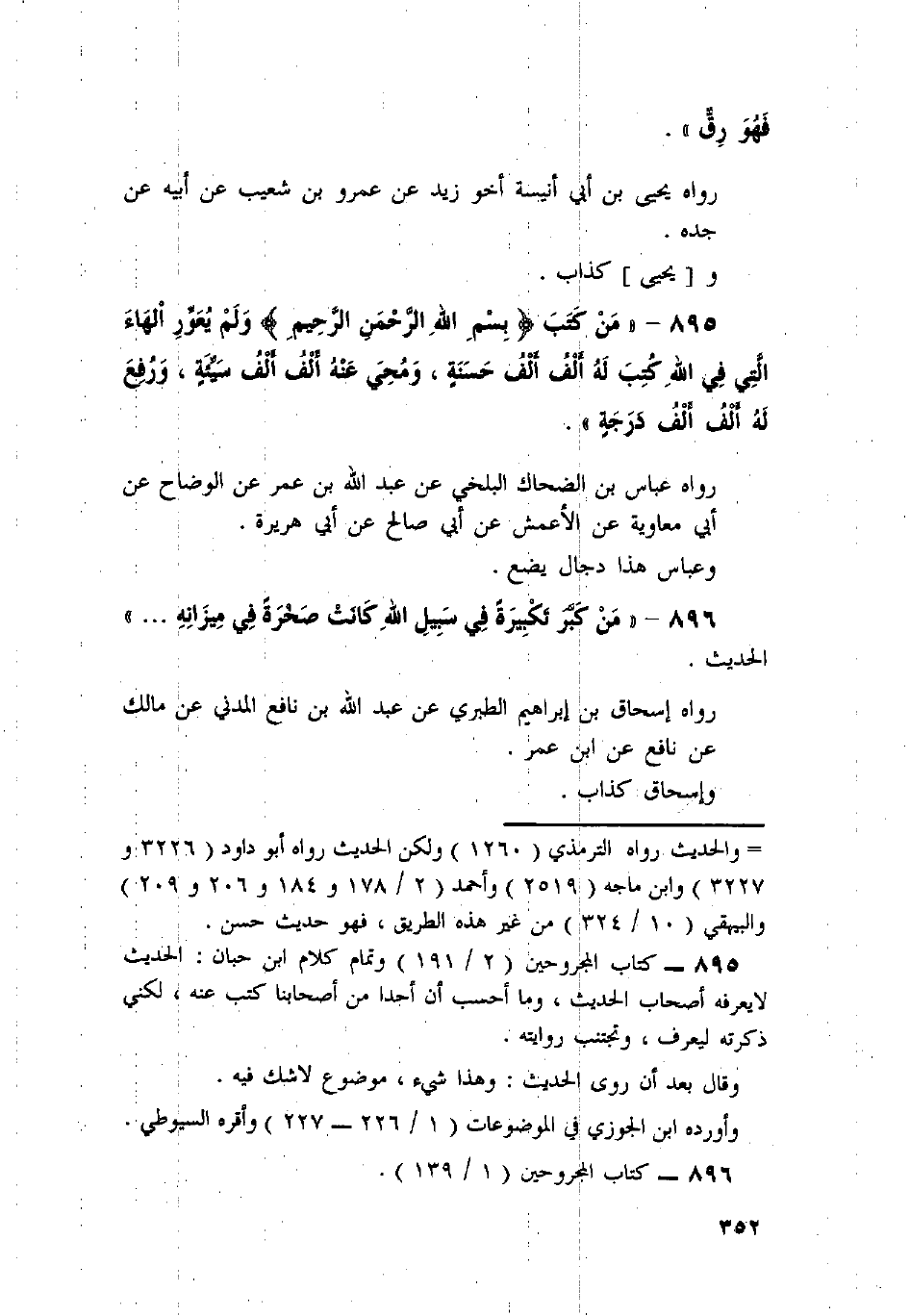 895 - " مَنْ كَتَبَ {بِسْمِ اللَّهِ الرَّحْمَنِ الرَّحِيمِ} [الفاتحة: 1] وَلَمْ يُعَوِّرِ الْهَاءَ الَّتِي فِي اللَّهِ كُتِبَ لَهُ أَلْفُ أَلْفِ حَسَنَةٍ، وَمُحِيَ عَنْهُ أَلْفُ أَلْفِ سَيِّئَةٍ، وَرُفِعَ لَهُ أَلْفُ أَلْفِ دَرَجَةٍ ".