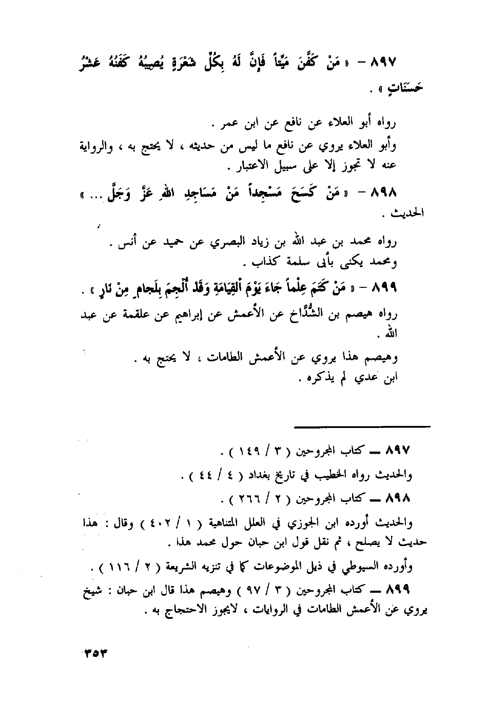897 - «مَنْ كَفَّنَ مَيِّتًا فَإِنَّ لَهُ بِكُلِّ شَعْرَةٍ يُصِيبُهُ كَفَنُهُ عَشْرَ حَسَنَاتٍ» .