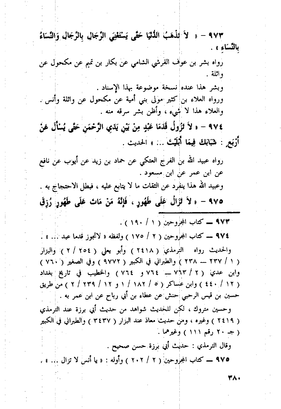 974 - " لا تَزُولُ قَدَمَا عَبْدٍ مِنْ بَيْنِ يَدَيِ الرَّحْمَنِ حَتَّى يُسْأَلَ عَنْ أَرْبَعٍ: شَبَابِكَ فِيمَا أَبْلَيْتَ. . . " الْحَدِيثَ.