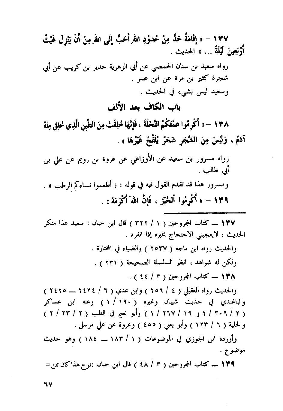 138 - «أَكْرِمُوا عَمَّتَكُمُ النَّخْلَةَ، فَإِنَّهَا خُلِقَتْ مِنَ الطِّينِ الَّذِي خُلِقَ مِنْهُ آدَمُ، وَلَيْسَ مِنَ الشَّجَرِ شَجَرٌ يُلَقَّحُ غَيْرُهَا» .