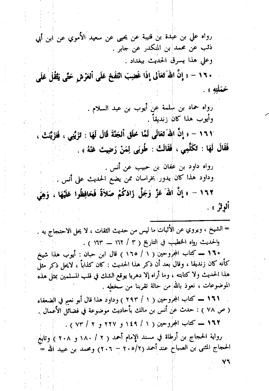 160 - «إِنَّ اللَّهَ تَعَالَى إِذَا غَضِبَ انْتَفَخَ عَلَى الْعَرْشِ حَتَّى يَثْقُلَ عَلَى حَمَلَتِهِ» .