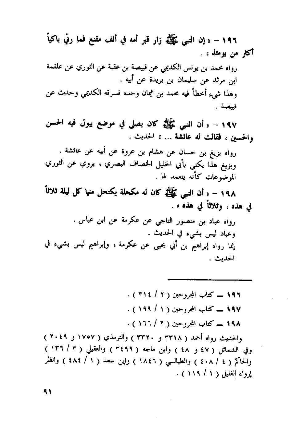 196 - «إِنَّ النَّبِيَّ صَلَّى اللَّهُ عَلَيْهِ وَسَلَّمَ زَارَ قَبْرَ أُمِّهِ فِي أَلْفِ مُقَنَّعٍ فَمَا رُئِيَ بَاكِيًا أَكْثَرَ مِنْ يَوْمَئِذٍ» .