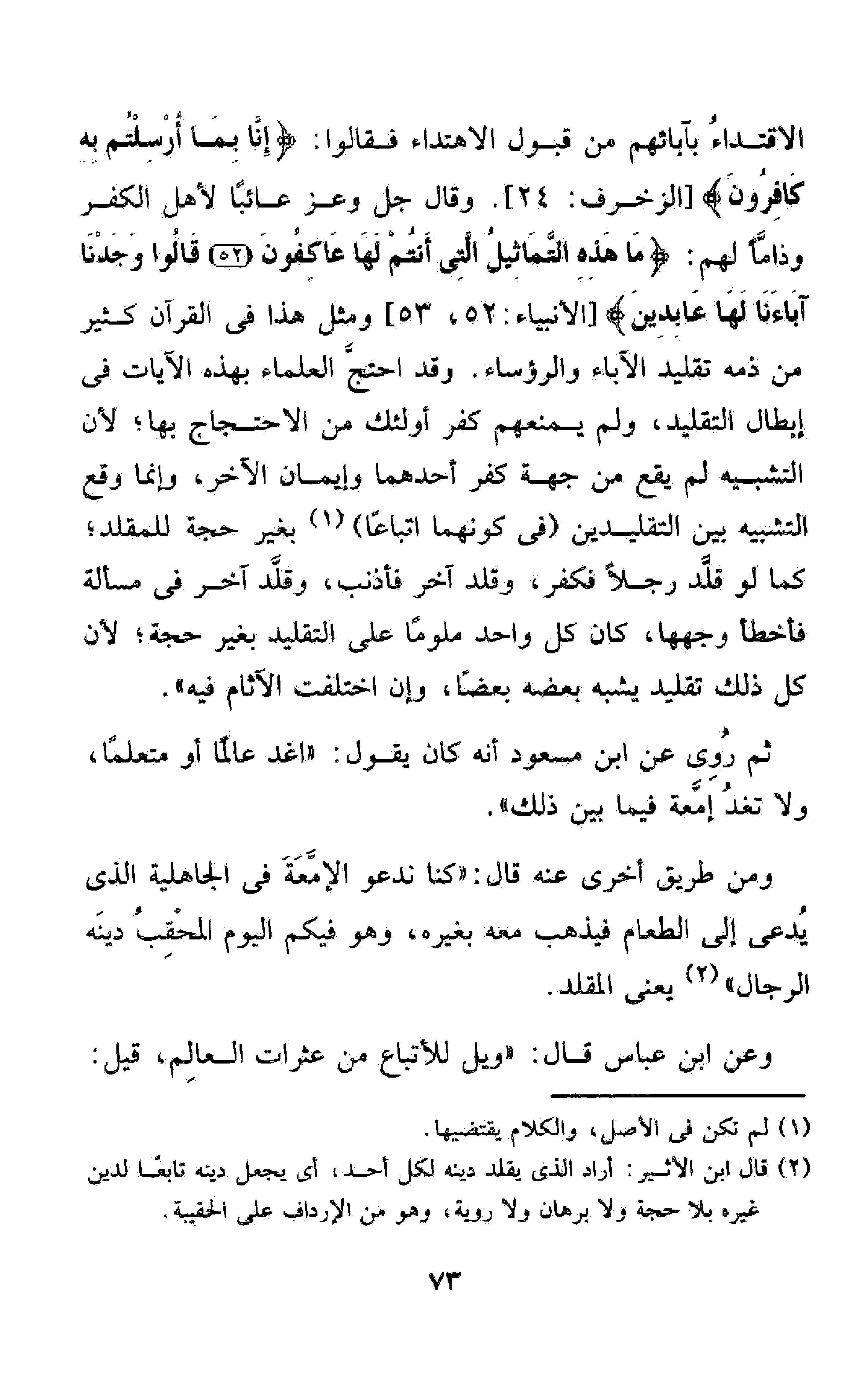 ثم روي عن ابن مسعود أنه كان يقول: "اغد عالما أو متعلما ولا تغد إمعة فيما بين ذلك "ومن طريق أخرى عنه قال: "كنا ندعوا الإمعة في الجاهلية الذي يدعى إلى الطعام فيذهب معه بغيره وهو فيكم اليوم المحقب دينه الرجال"2 يعني المقلد.