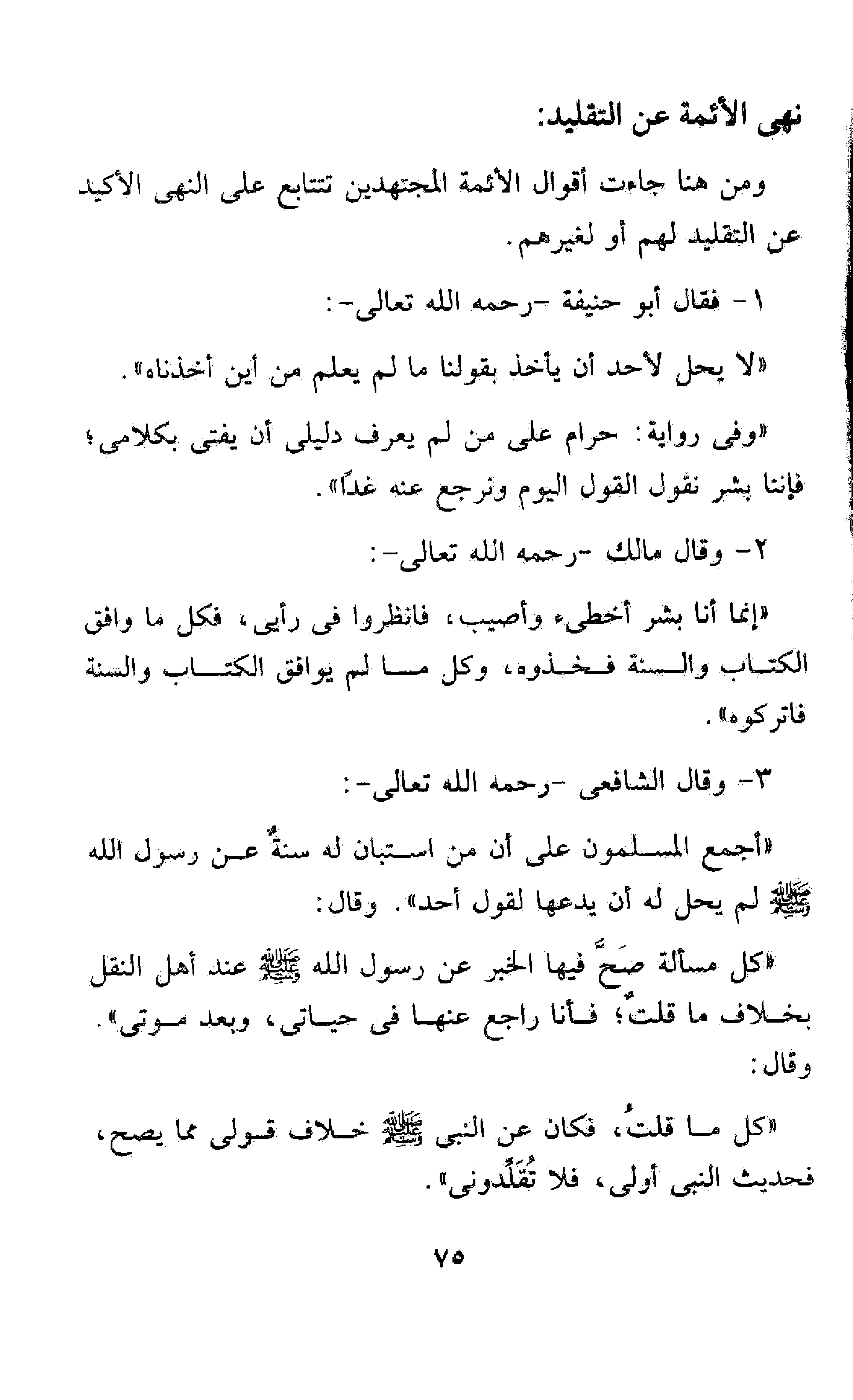 ومن هنا جاءت أقوال الأئمة المجتهدين تتتابع على النهي الأكيد عن التقليد لهم أو لغيرهم