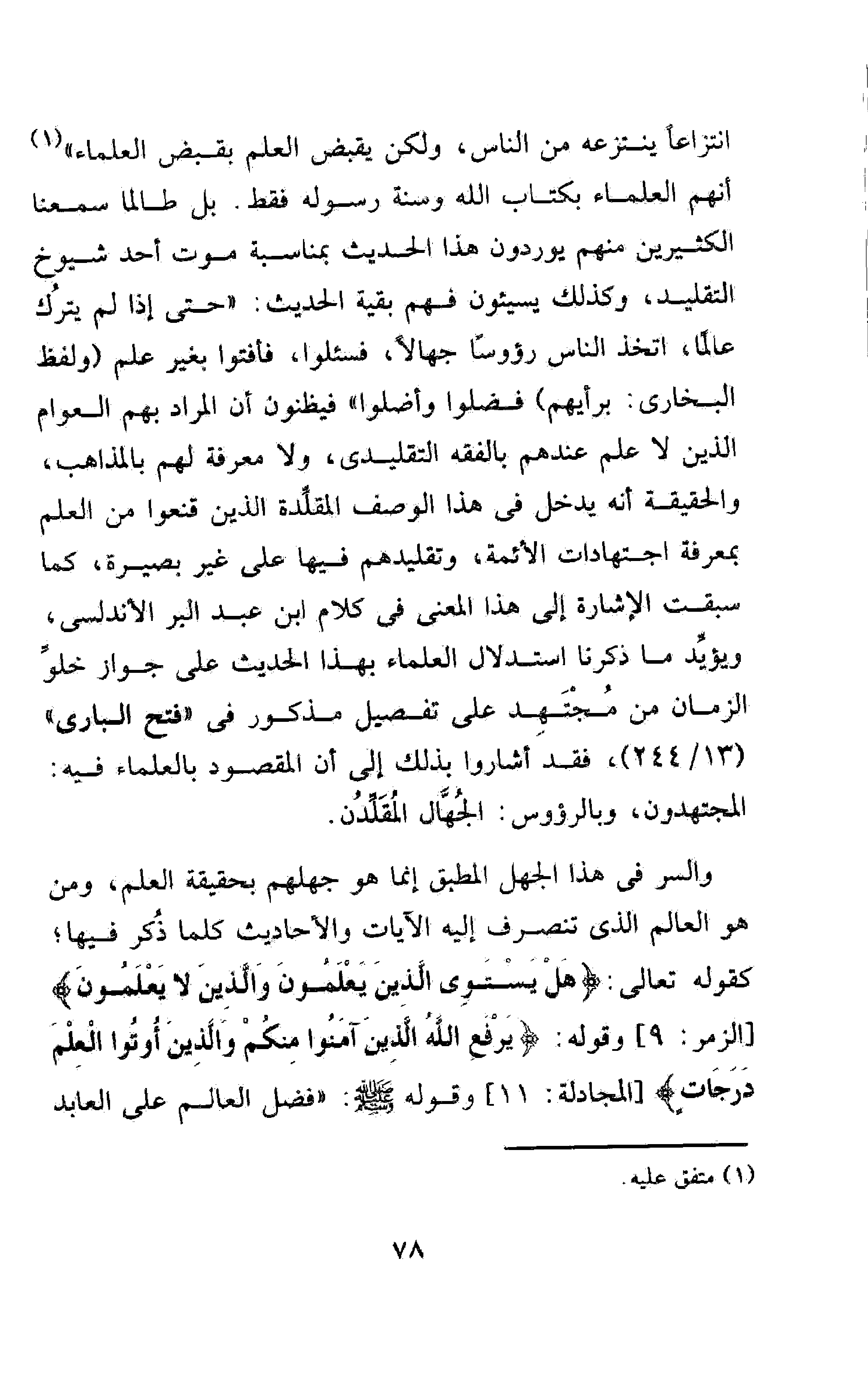 أنهم العلماء بكتاب الله وسنة رسوله فقط. بل طالما سمعنا الكثيرين منهم يوردون هذا الحديث بمناسبة موت أحد شيوخ التقليد وكذلك يسيئون فهم بقية الحديث: "حتى إذا لم يترك عالما اتخذ الناس رؤوسا جهالا فسئلوا فأفتوا بغير علم ولفظ البخاري: برأيهم "فضلوا وأضلوا" فيظنون أن المراد بهم العوام الذين لا علم عندهم بالفقه التقليدي ولا معرقة لهم بالمذاهب والحقيقة أنه يدخل في هذا الوصف المقلدة الذين قنعوا من العلم بمعرفة اجتهادات الأئمة وتقليدهم فيها على غير بصيرة كما سبقت الإشارة إلى هذا المعنى في كلام ابن عبد البر الأندلسي. ويؤيد ما ذكرنا استدلال العلماء بهذا الحديث على جواز خلو الزمان من مجتهد على تفصيل مذكور في "فتح الباري" "13/244" فقد أشاروا بذلك إلى أن المقصود بالعلماء فيه المجتهدون وبالرؤوس: الجهال المقلدون.