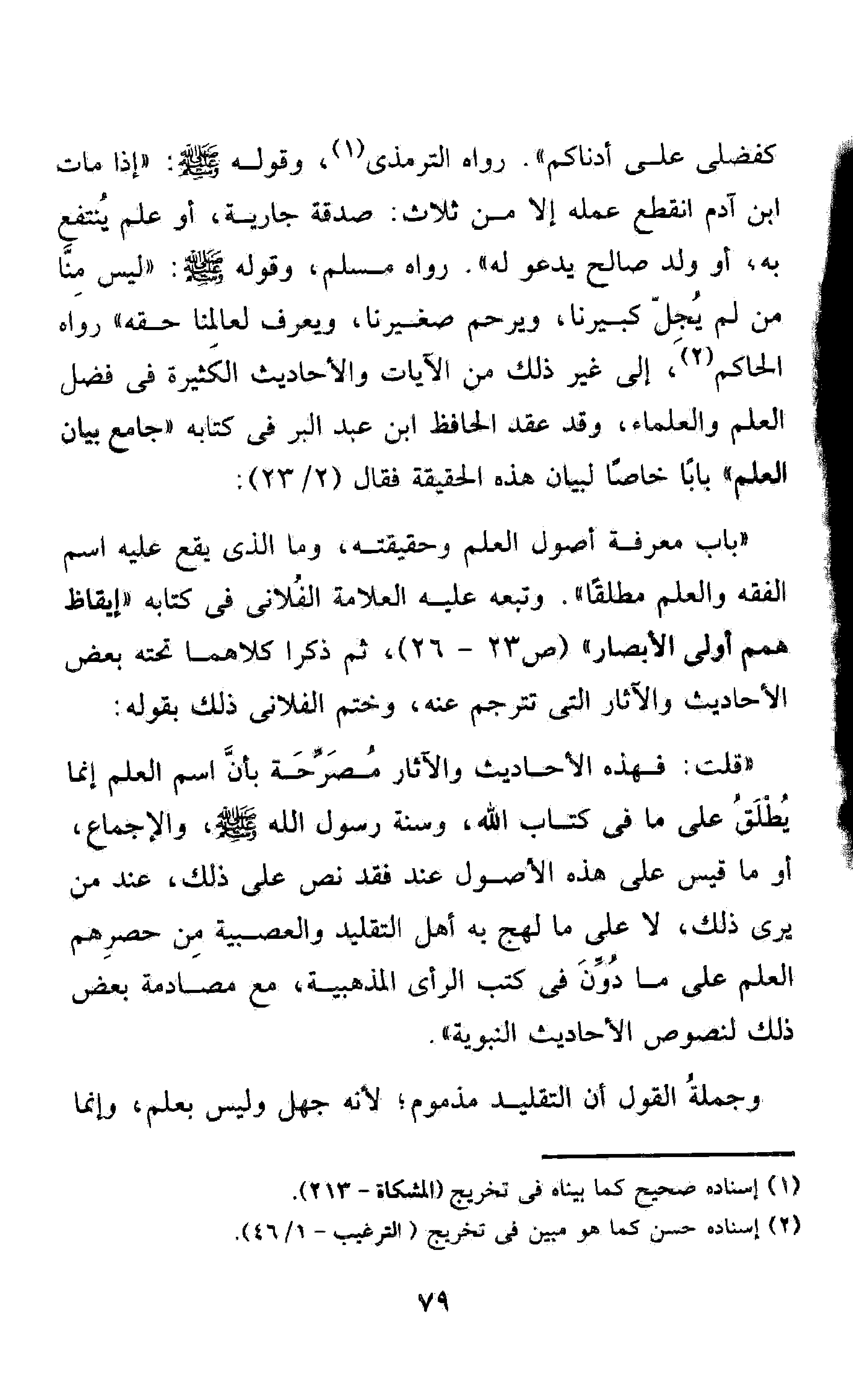 كفضلي على أدناكم" رواه الترمذي1 وقوله صلى الله عليه وآله وسلم: "إذا مات ابن آدم انقطع عمله إلا من ثلاث: صدقة جارية أو علم ينتفع به أو ولد صالح يدعو له". رواه مسلم. وقوله صلى الله عليه وآله وسلم: "ليس منا من لم يجل كبيرنا ويرحم صغيرنا ويعرف لعالمنا حقه" رواه الحاكم2 إلى غير ذلك من الآيات والأحاديث الكثيرة في فضل العلم والعلماء وقد عقد الحافظ ابن عبد البر في كتابه "جامع بيان العلم" بابا خاصا لبيان هذه الحقيقة فقال "2/23".