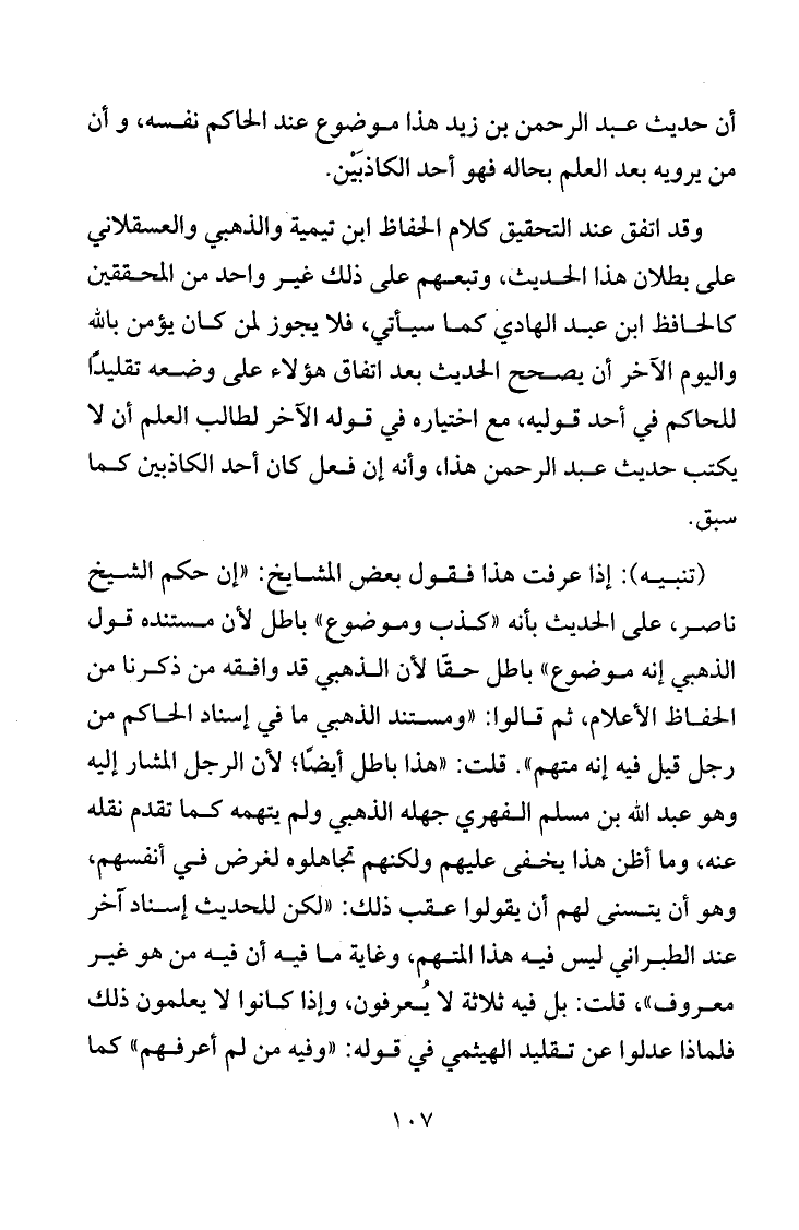 وقد اتفق عند التحقيق كلام الحفاظ ابن تيمية والذهبي والعسقلاني على بطلان هذا الحديث، وتبعهم على ذلك غير واحد من المحققين كالحافظ ابن عبد الهادي كما سيأتي، فلا يجوز لمن كان يؤمن بالله واليوم الآخر أن يصحح الحديث بعد اتفاق هؤلاء على وضعه تقليداً للحاكم في أحد قوليه، مع اختياره في قوله الآخر لطالب العلم أن لا يكتب حديث عبد الرحمن هذا، وأنه إن فعل كان أحد الكاذبين كما سبق.