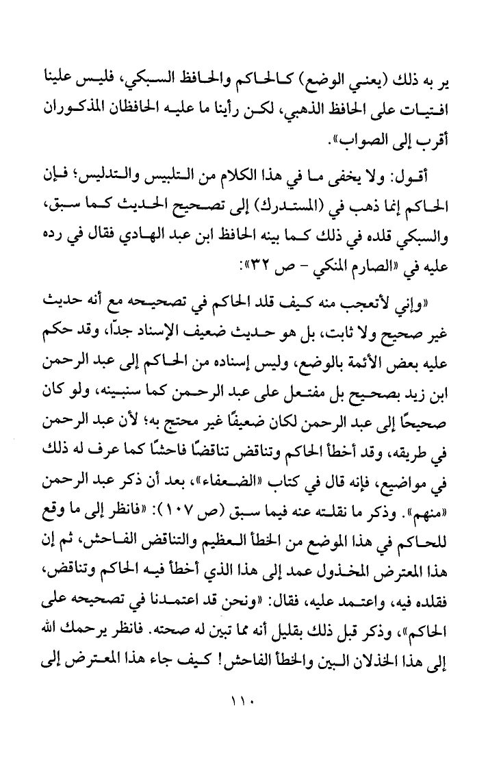 "وإني لأتعجب منه كيف قلد الحاكم في تصحيحه مع أنه حديث غير صحيح ولا ثابت، بل هو حديث ضعيف الإسناد جداً، وقد حكم عليه بعض الأئمة بالوضع، وليس إسناده من الحاكم إلى عبد الرحمن بن زيد بصحيح بل مفتعل على عبد الرحمن كما سنبينه، ولو كان صحيحاً إلى عبد الرحمن لكان ضعيفاً غير محتج به، لأن عبد الرحمن في طريقه، وقد أخطأ الحاكم وتناقض تناقضاً فاحشاً كما عرف له ذلك في مواضيع، فإنه قال في كتاب "الضعفاء"، بعد أن ذكر عبد الرحمن "منهم". وذكر ما نقلته عنه فيما سبق "ص107": فانظر إلى ما وقع للحاكم في هذا الموضع من الخطأ العظيم والتناقض الفاحش، ثم إن هذا المعترض المخذول عمد إلى هذا الذي اخطأ فيه الحاكم وتناقض، فقلده فيه، واعتمد عليه، فقال: "ونحن قد اعتمدنا في تصحيحه على الحاكم"، وذكر قبل ذلك بقليل أنه مما تبين له صحته. فانظر يرحمك الله إلى هذا الخذلان البين والخطأ الفاحش! كيف جاء هذا المعترض إلى
