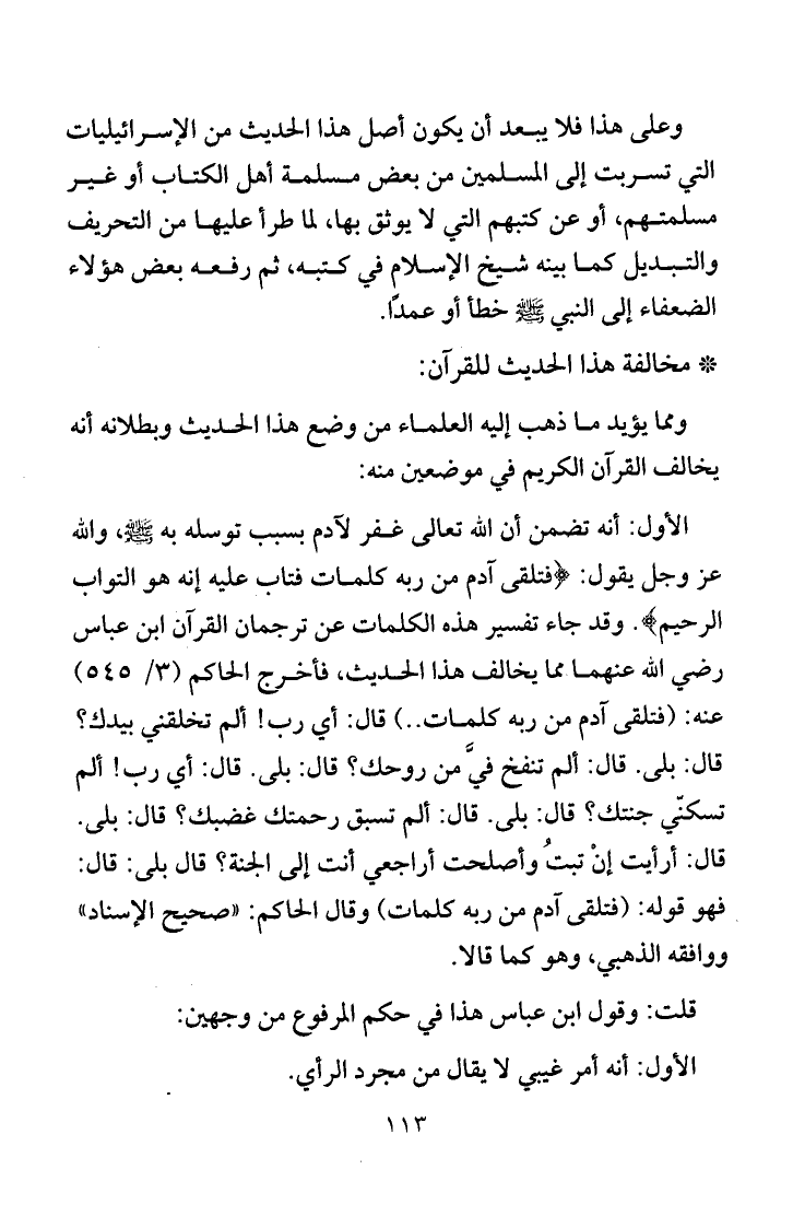 الأول: أنه تضمن أن الله تعالى غفر لآدم بسبب توسله به صلى الله عليه وسلم، والله عز وجل يقول: {فَتَلَقَّى آدَمُ مِنْ رَبِّهِ كَلِمَاتٍ فَتَابَ عَلَيْهِ إِنَّهُ هُوَ التَّوَّابُ الرَّحِيمُ} . وقد جاء تفسير هذه الكلمات عن ترجمان القرآن ابن عباس رضي الله عنهما مما يخالف هذا الحديث، فأخرج الحاكم "3/545" عنه: {فَتَلَقَّى آدَمُ مِنْ رَبِّهِ كَلِمَاتٍ} قال: أي رب! ألم تخلقني بيدك؟ قال: بلى. قال: ألم تنفخ فيَّ من روحك؟ قال: بلى. قال: أي رب! ألم تسكنّي جنتك؟ قال: بلى. قال: ألم تسبق رحمتك غضبك؟ قال: بلى. قالت: أرأيت إن تبتُ وأصلحت، أراجعي أنت إلى الجنة؟ قال: بلى. قال: فهو قوله: {فَتَلَقَّى آدَمُ مِنْ رَبِّهِ كَلِمَاتٍ} وقال الحاكم: "صحيح الإسناد" ووافقه الذهبي، وهو كما قالا.