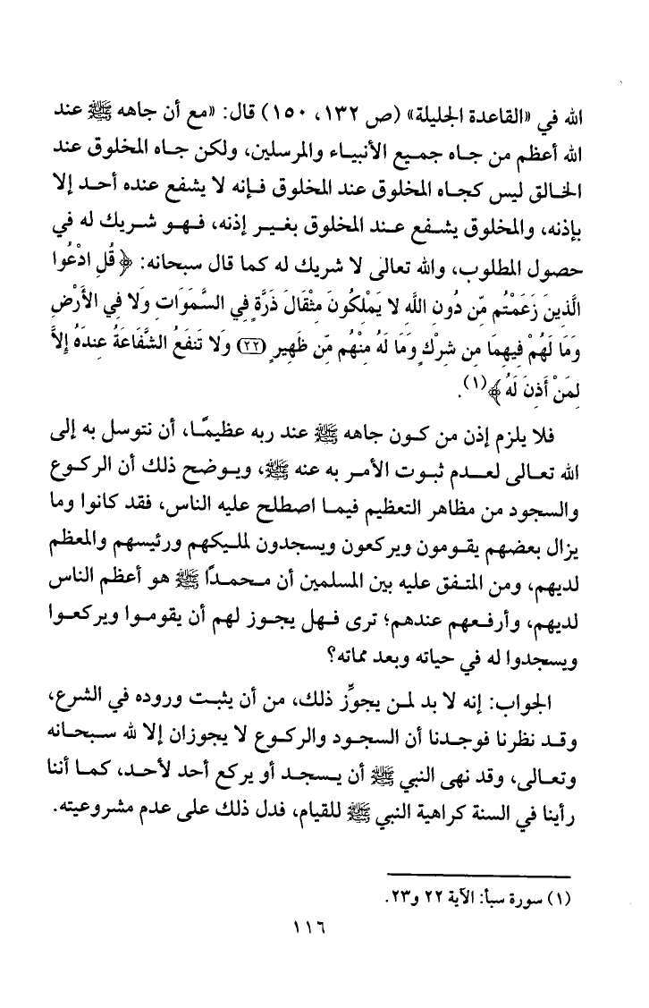 الله في "القاعدة الجليلة" "ص132، 150" قال: "مع أن جاهه صلى الله عليه وسلم عند الله أعظم من جاه جميع الأنبياء والمرسلين، ولكن جاه المخلوق عند الخالق ليس كجاه المخلوق عند المخلوق فإنه لا يشفع عنده أحد إلا بإذنه، والمخلوق يشفع عند المخلوق بغير إذنه، فهو شريك له في حصول المطلوب، والله تعالى لا شريك له كما قال سبحانه: {قُلِ ادْعُوا الَّذِينَ زَعَمْتُمْ مِنْ دُونِ اللَّهِ لا يَمْلِكُونَ مِثْقَالَ ذَرَّةٍ فِي السَّمَاوَاتِ وَلا فِي الْأَرْضِ وَمَا لَهُمْ فِيهِمَا مِنْ شِرْكٍ وَمَا لَهُ مِنْهُمْ مِنْ ظَهِيرٍ وَلا تَنْفَعُ الشَّفَاعَةُ عِنْدَهُ إِلَّا لِمَنْ أَذِنَ لَهُ} 1.