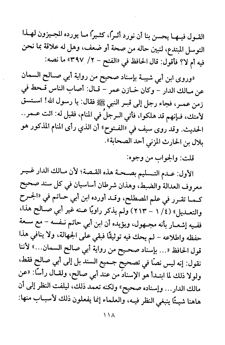 الأول: عدم التسليم بصحة هذه القصة، لأن مالك الدار غير معروف العدالة والضبط، وهذان شرطان أساسيان في كل سند صحيح كما تقرر في علم المصطلح، وقد أورده ابن أبي حاتم في "الجرح والتعديل" 4/1 - 213" ولم يذكر راوياً عنه غير أبي صالح هذا، ففيه إشعار بأنه مجهول، ويؤيده أن ابن أبي حاتم نفسه – مع سعة حفظه واطلاعه – لم يحك فيه توثيقاً فبقي على الجهالة، ولا ينافي هذا قول الحافظ: " ... بإسناد صحيح من رواية أبي صالح السمان ... " لأننا نقول: إنه ليس نصاً في تصحيح جميع السند بل إلى أبي صالح فقط، ولولا ذلك لما ابتدأ هو الإسنادَ من عند أبي صالح، ولقال رأساً: "عن مالك الدار ... وإسناده صحيح"، ولكنه تعمد ذلك، ليلفت النظر إلى أن ها هنا شيئاً ينبغي النظر فيه، والعلماء إنما يفعلون ذلك لأسباب منها: