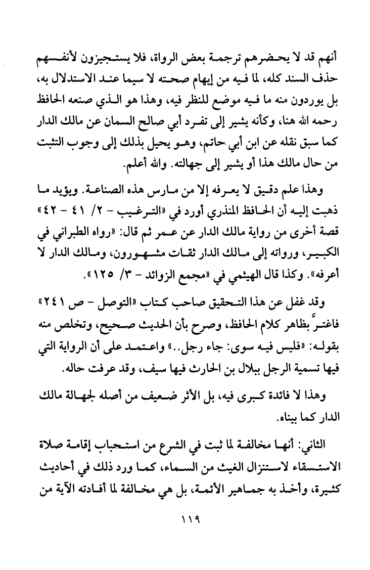 وهذا علم دقيق لا يعرفه إلا من مارس هذه الصناعة، ويؤيد ما ذهبت اليه أن الحافظ المنذري أورد في "الترغيب-2/41-42" قصة أخرى من رواية مالك الدار عن عمر ثم قال: "رواه الطبراني في "الكبير"، ورواته إلى مالك الدار ثقات مشهورون، ومالك الدار لا أعرفه". وكذا قال الهيثمي في "مجمع الزوائد - 3/125".
