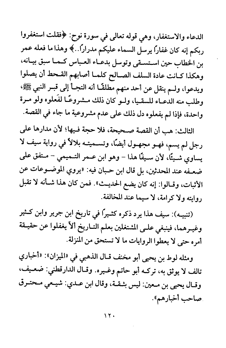 الثالث: هب أن القصة صحيحة، فلا حجة فيها، لأن مدارها على رجل لم يسم، فهو مجهول أيضاً، وتسميته بلالاً في رواية سيف لا يساوي شيئاً، لأن سيفاً هذا – وهوابن عمر التميمي – متفق على ضعفه عند المحدثين، بل قال ابن حبان فيه: "يروي الموضوعات عن الأثبات، وقالوا: إنه كان يضع الحديث". فمن كان هذا شأنه لا تقبل روايته ولا كرامة، لا سيما عند المخالفة.