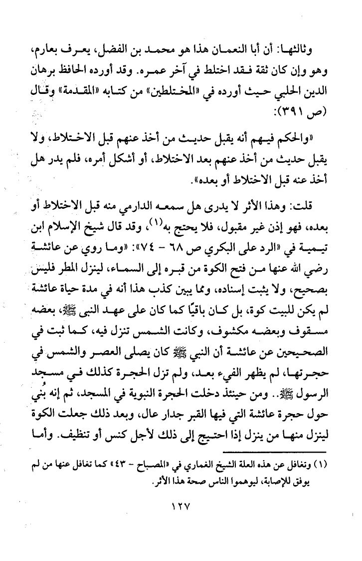 قلت: وهذا الأثر لا يدرى هل سمعه الدارمي منه قبل الاختلاط أو بعده، فهو إذن غير مقبول، فلا يحتج به1، وقد قال شيخ الإسلام ابن تيمية في"الرد على البكري ص 68-74": "وما روي عن عائشة رضي الله عنها من فتح الكوة من قبره إلى السماء، لينزل المطر فليس بصحيح، ولا يثبت إسناده، ومما يبين كذب هذا أنه في مدة حياة عائشة لم يكن للبيت كوة، بل كان باقياً كما كان على عهد النبي صلى الله عليه وسلم، بعضه مسقوف وبعضه مكشوف، وكانت الشمس تنزل فيه، كما ثبت في "الصحيحين" عن عائشة أن النبي صلى الله عليه وسلم كان يصلي العصر والشمس في حجرتها، لم يظهر الفيء بعد، ولم تزل الحجرة النبوية كذلك في مسجد الرسول صلى الله عليه وسلم.. ومن حينئذ دخلت الحجرة النبوية في المسجد، ثم إنه يُبنى حول حجرة عائشة التي فيها القبر جدار عال، وبعد ذلك جعلت الكوة لينزل منها من ينزل إذا احتيج إلى ذلك لأجل كنس أو تنظيف. وأما