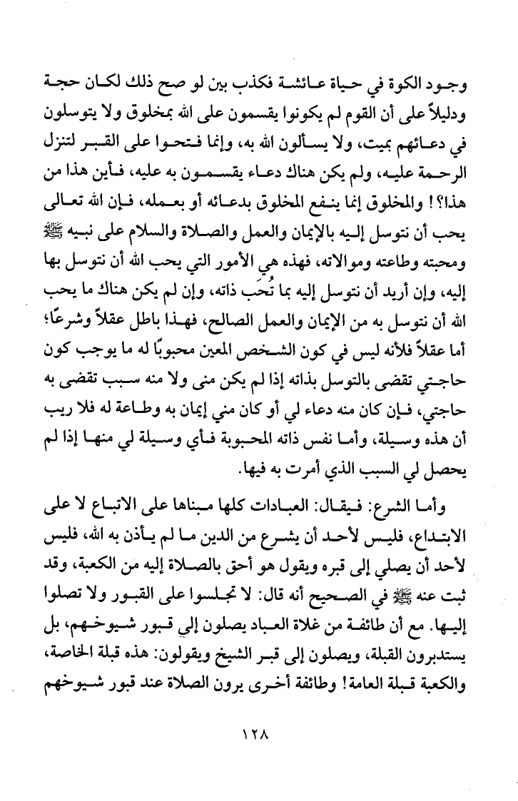 وجود الكوة في حياة عائشة فكذب بين لو صح ذلك لكان حجة ودليلاً على أن القوم لم يكونوا يقسمون على الله بمخلوق ولا يتوسلون في دعائهم بميت، ولا يسألون الله به، وإنما فتحوا على القبر لتنزل الرحمة عليه، ولم يكن هناك دعاء يقسمون به عليه، فأين هذا من هذا، والمخلوق إنما ينفع المخلوق بدعائه أو بعمله، فإن الله تعالى يحب أن نتوسل اليه بالإيمان والعمل والصلاة والسلام على نبيه صلى الله عليه وسلم ومحبته وطاعته وموالاته، فهذه هي الأمور التي يحب الله أن نتوسل بها إليه، وإن أريد أن نتوسل إليه بما تُحَبُ ذاته، وإن لم يكن هناك ما يحب الله أن نتوسل به من الإيمان والعمل الصالح، فهذا باطل عقلاً وشرعاً، أما عقلاً فلأنه ليس في كون الشخص المعين محبوباً له ما يوجب كون حاجتي تقضى بالتوسل بذاته إذا لم يكن مني ولا منه سبب تقضى به حاجتي، فإن كان منه دعاء لي أو كان مني إيمان به وطاعة له فلا ريب أن هذه وسيلة، وأما نفس ذاته المحبوبة فأي وسيلة لي منها إذا لم يحصل لي السبب الذي أمرت به فيها.