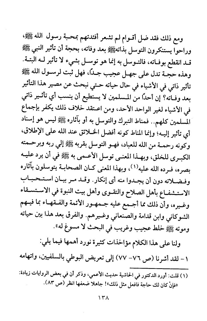 ومع ذلك فقد ضل أقوام لم تشعر أفئدتهم بمحبة رسول الله صلى الله عليه وسلم، وراحوا يستنكرون التوسل بذاته صلى الله عليه وسلم بعد وفاته، بحجة أن تأثير النبي صلى الله عليه وسلم قد انقطع بوفاته، فالتوسل به إنما هو توسل بشيء تأثير له البتة. وهذه حجة تدل على جهل عجيب جداً، فهل ثبت لرسول الله صلى الله عليه وسلم تأثير ذاتي في الأشياء في حال حياته حتى نبحث عن مصير هذا التأثير بعد وفاته؟ إن أحداً من المسلمين لا يستطيع أن ينسب أي تأثير ذاتي في الأشياء لغير الواحد الأحد، ومن اعتقد خلاف ذلك يكفر بإجماع المسلمين كلهم ... فمناط التبرك والتوسل به أو بآثاره صلى الله عليه وسلم ليس هو إسناد أي تأثير إليه، وإنما المناط كونه أفضل الخلائق عند الله على الإطلاق، وكونه رحمة من الله للعباد، فهو التوسل بقربه صلى الله عليه وسلم إلى ربه وبرحمته الكبرى للخلق، وبهذا المعنى توسل الأعمى به صلى الله عليه وسلم في أن يرد عليه بصره، فرده الله عليه1، وبهذا المعنى كان الصحابة يتوسلون بآثاره وفضلاته دون أن يجدوا منه أي إنكار. وقد مر بيان استحباب الاستشفاع بأهل الصلاح والتقوى وأهل بيت النبوة في الاستسقاء وغيره، وأن ذلك مما أجمع عليه جمهور الأئمة والفقهاء بما فيهم الشوكاني وابن قدامة والصنعاني وغيرهم. والفرق بعد هذا بين حياته وموته صلى الله عليه وسلم خلط عجيب وغريب في البحث لا مسوغ له".