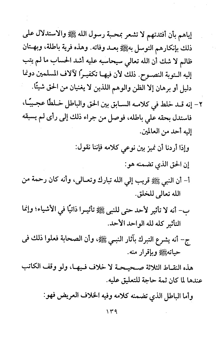 إياهم بأن أفئدتهم لا تشعر بمحبة رسول الله صلى الله عليه وسلم والاستدلال على ذلك بإنكارهم التوسل به صلى الله عليه وسلم بعد وفاته. وهذه فرية باطلة، وبهتان ظالم لا شك أن الله تعالى سيحاسبه عليه أشد الحساب ما لم يتبْ إليه التوبة النصوح. ذلك لأن فيها تكفيراً لآلاف المسلمين دونما دليل أو برهان إلا الظن والوهم اللذين لا يغنيان من الحق شيئاً.