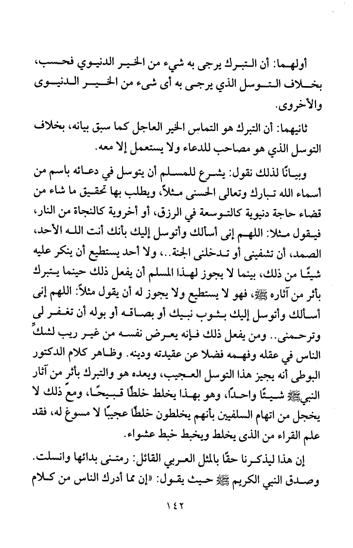 وبياناً لذلك نقول: يشرع للمسلم أن يتوسل في دعائه باسم من أسماء الله تبارك وتعالى الحسنى مثلاً، ويطلب بها تحقيق ما شاء من قضاء حاجة دنيوية كالتوسعة في الرزق، أو أخروية كالنجاة من النار، فيقول مثلاً: اللهم إني أسألك وأتوسل إليك بأنك أنت الله الأحد، الصمد، أن تشفيني أو تدخلني الجنة ... ، ولا أحد يستطيع أن ينكر عليه شيئاً من ذلك، بينما لا يجوز لهذا المسلم أن يفعل ذلك حينما يتبرك بأثر من آثاره صلى الله عليه وسلم، فهو لا يستطيع ولا يجوز له أن يقول مثلاً: اللهم إني أسألك وأتوسل إليك بثوب نبيك أو بصاقه أو بوله أن تغفر لي وترحمني.. ومن يفعل ذلك فإنه يعرّض نفسه من غير ريب ليشك الناس في عقله وفهمه فضلاً عن عقيدته ودينه. وظاهر كلام الدكتور أنه يجيز هذا التوسل العجيب، ويعده هو والتبرك بأثر من آثار النبي صلى الله عليه وسلم شيئاً واحداً، وهو بهذا يخلط خلطاً قبيحاً، ومع ذلك لا يخجل من اتهام السلفيين بأنهم يخلطون خلطاً عجيباً لا مسوغ له، فقد علم القراء من الذين يخلط ويخبط خبط عشواء.