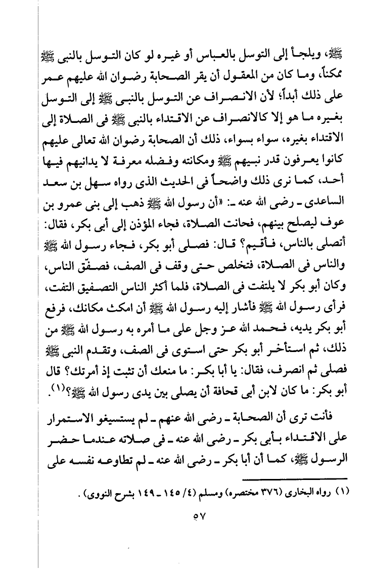 صلى الله عليه وسلم, ويلجأ إلى التوسل بالعباس أو غيره لو كان التوسل بالنبي صلى الله عليه وسلم ممكناً، وما كان من المعقول ان يقر الصحابة رضوان الله عليهم عمر على ذلك أبداً، لأن الإنصراف عن التوسل بالنبي صلى الله عليه وسلم إلى التوسل بغيره ما هو إلا كالإنصراف عن الإقتداء بالنبي صلى الله عليه وسلم في الصلاة إلى الإقتداء بغيره، سواء بسواء، ذلك أن الصحابة رضوان الله تعالى عليهم كانوا يعرفون قدر نبيهم صلى الله عليه وسلم ومكانته وفضله معرفة لا يدانيهم فيها أحد، كما نرى ذلك واضحاً في الحديث الذي رواه سهل بن سعد الساعدي رضي الله عنه: أن رسول الله صلى الله عليه وسلم ذهب إلى بني عمرو بن عوف ليصلح بينهم، فحانت الصلاة، فجاء المؤذن إلى أبي بكر، فقال: أتصلي بالناس، فأقيم؟ قال: فصلى أبو بكر، فجاء رسول الله صلى الله عليه وسلم والناس في الصلاة، فتخلص حتى وقف في الصف، فصفق الناس، وكان أبو بكر لا يلتفت في الصلاة، فلما أكثر الناس التصفيق التفت، فرأى رسول الله صلى الله عليه وسلم، فأشار إليه رسول الله صلى الله عليه وسلم أن أمكث مكانك، فرفع أبو بكر يديه، فحمد الله عز وجل على ما أمره به رسول الله صلى الله عليه وسلم من ذلك، ثم استأخر أبو بكر حتى استوى في الصف، وتقدم النبي صلى الله عليه وسلم فصلى ثم انصرف، فقال: "يا أبا بكر: ما منعك أن تثبت إذ أمرتك؟ " قال أبو بكر: ما كان لابن أبي قحافة أن يصلي بين يدي رسول الله صلى الله عليه وسلم؟ 1.