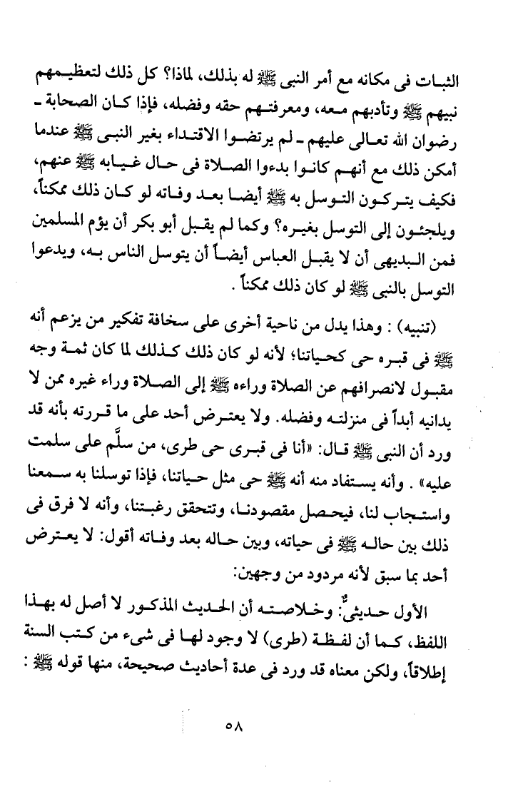"تنبيه": وهذا يدل من ناحية أخرى على سخافة تفكير من يزعم أنه صلى الله عليه وسلم في قبره حي كحياتنا، لأنه لو كان ذلك كذلك لما كان ثمة وجه مقبول لانصرافهم عن الصلاة وراءه صلى الله عليه وسلم إلى الصلاة وراء غيره ممن لا يدانيه أبداً في منزلته وفضله. ولا يعترض احد على ما قررته بأنه قد ورد أن النبي صلى الله عليه وسلم قال: "أنا في قبري حي طري، من سلم علي سلمت عليه". وأنه يستفاد منه أنه صلى الله عليه وسلم حي مثل حياتنا، فإذا توسل به سمعنا واستجاب لنا، فيحصل مقصودنا، وتتحقق رغبتنا، وأنه لا فرق في ذلك بين حاله صلى الله عليه وسلم في حياته، وبين حاله بعد وفاته أقول: لا يعترض أحد بما سبق لأنه مردود من وجهين: