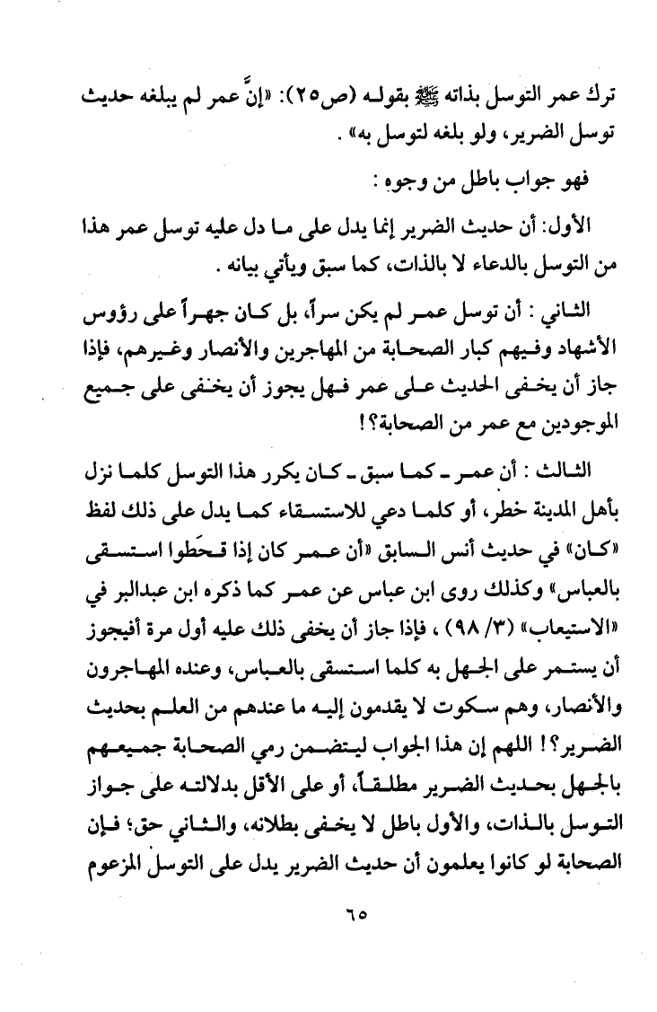 ترك عمر التوسل بذاته صلى الله عليه وسلم بقوله "ص25": "إن عمر لم يبلغه حديث توسل الضرير، ولو بلغه لتوسل به".