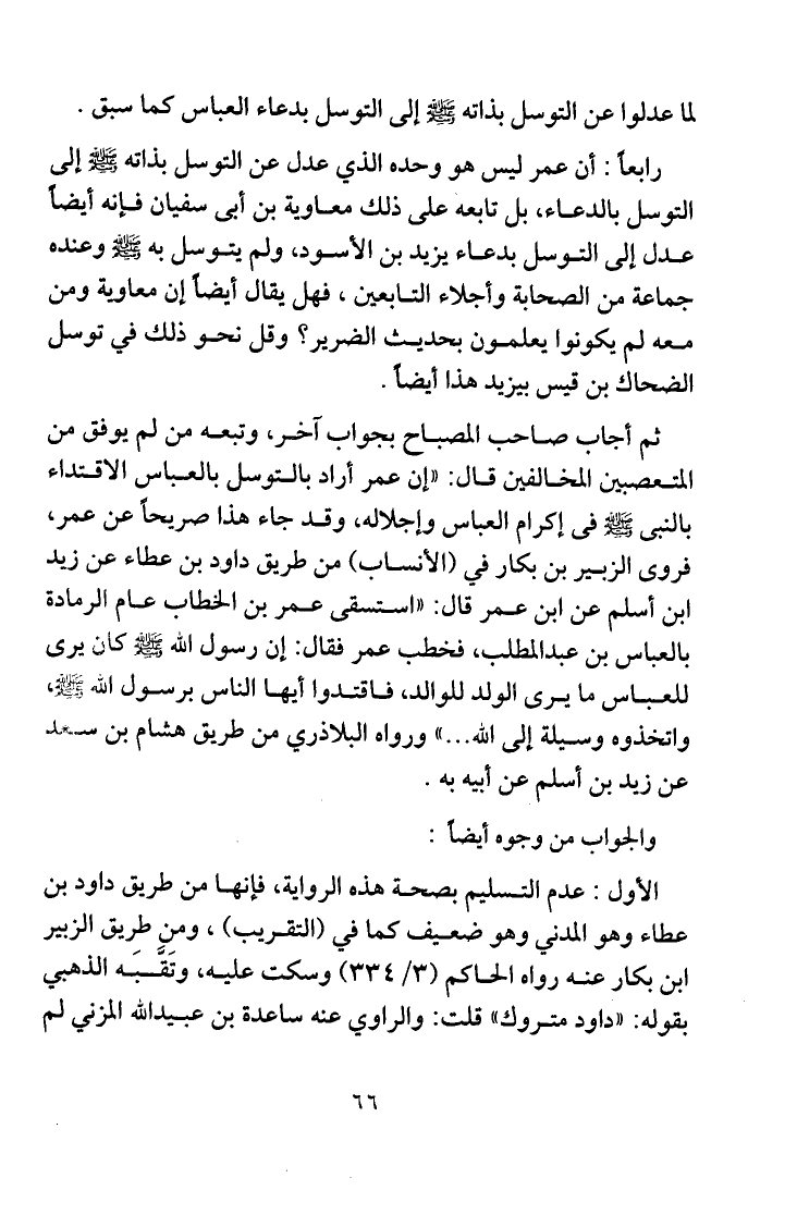 ثم أجاب صاحب المصباح بجواب آخر، وتبعه من لم يوفق من المتعصبين المخالفين فقال: إن عمر أراد بالتوسل بالعباس الإقتداء بالنبي صلى الله عليه وسلم في إكرام العباس وإجلاله، وقد جاء هذا صريحاً عن عمر، فروى الزبير بن بكار في "الأنساب" من طريق داود بن عطاء عن زيد بن أسلم عن ابن عمر قال: "استسقى عمر ابن الخطاب عام الرمادة بالعباس بن عبد المطلب، فخطب عمر فقال: إن رسول صلى الله عليه وسلم كان يرى للعباس ما يرى الولد للوالد، فاقتدوا أيها الناس برسول الله صلى الله عليه وسلم، واتخذوه وسيلة إلى الله ... "، ورواه البلاذري من طريق هشام بن سعد عن زيد بن أسلم عن أبيه به.
