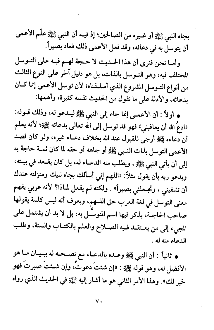 أولاً: أن الأعمى إنما جاء إلى النبي صلى الله عليه وسلم ليدعو له، وذلك قوله: "أدعُ الله أن يعافيني"، فهو توسل إلى الله تعالى بدعائه صلى الله عليه وسلم، لأنه يعلم أن دعاءه صلى الله عليه وسلم أرجى للقبول عند الله بخلاف دعاء غيره، ولو كان قصد الأعمى التوسل بذات النبي صلى الله عليه وسلم أو جاهه أو حقه لما كان ثمة حاجة به إلى أن يأتي النبي صلى الله عليه وسلم، ويطلب منه الدعاء له، بل كان يقعد في بيته، ويدعو ربه بأن يقول مثلاً: اللهم إني أسألك بجاه نبيك ومنزلته عندك أن يشفيني، وتجعلني بصيراً. ولكنه لم يفعل، لماذا؟ لأنه عربي يفهم معنى التوسل في لغة العرب حق الفهم، ويعرف أنه ليس كلمة يقولها صاحب الحاجة، يذكر فيها اسم الموسَّل به، بل لابد أن يشتمل على المجيء إلى من يعتقد فيه الصلاح والعلم بالكتاب والسنة، وطلب الدعاء منه له.