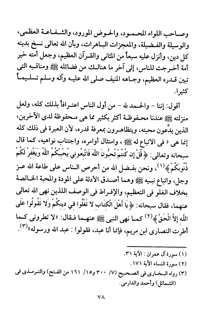 أقول: إننا – والحمد لله – من أول الناس اعترافاً بذلك كله، ولعل منزلته صلى الله عليه وسلم عندنا محفوظة أكثر بكثير مما هي محفوظة لدى الآخرين، الذين يدعون محبته، ويتظاهرون بمعرفة قدره، لأن العبرة في ذلك كله إنما هي في الاتباع له صلى الله عليه وسلم، وامتثال أوامره، واجتناب نواهيه، كما قال سبحانه وتعالى: {قُلْ إِنْ كُنْتُمْ تُحِبُّونَ اللَّهَ فَاتَّبِعُونِي يُحْبِبْكُمُ اللَّهُ وَيَغْفِرْ لَكُمْ ذُنُوبَكُمْ} 1، ونحن بفضل الله من أحرص الناس على طاعة الله عز وجل، واتباع نبيه صلى الله عليه وسلم وهما أصدق الأدلة على المودة والمحبة الخالصة بخلاف الغلو في التعظيم، والإفراط في الوصف اللذين نهى الله تعالى عنهما، فقال سبحانه: {يَا أَهْلَ الْكِتَابِ لا تَغْلُوا فِي دِينِكُمْ وَلا تَقُولُوا عَلَى اللَّهِ إِلَّا الْحَقَّ} 2 كما نهى النبي صلى الله عليه وسلم عنهما فقال: "لا تطروني كما أطرت النصارى ابن مريم، فإنما أنا عبد، فقولوا: عبد الله ورسوله" 3.