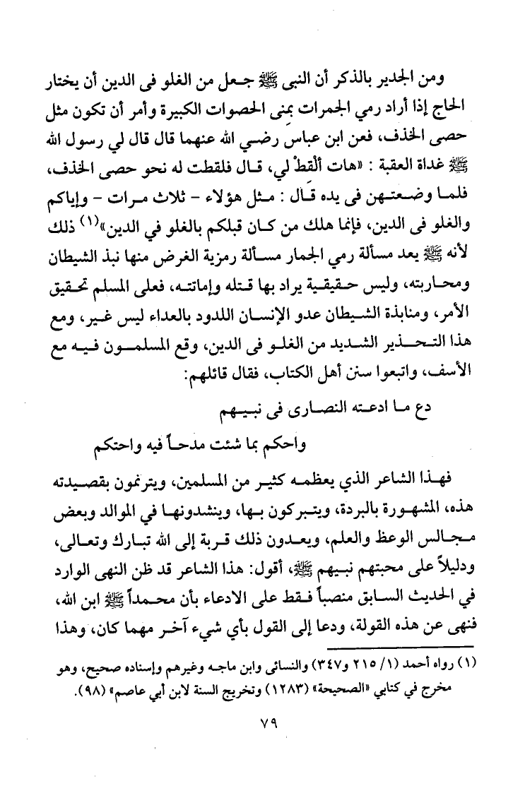 ومن الجدير بالذكر أن النبي صلى الله عليه وسلم جعل من الغلو في الدين أن يختار الحاج إذا أراد رمي الجمرات بمنى الحصوات الكبيرة وأمر أن تكون مثل حصى الخذف، فعن ابن عباس رضي الله عنهما قال: قال لي رسول الله صلى الله عليه وسلم غداة العقبة: "هات ألْقِطْ لي". قال: فلقطت له نحو حصى الخذف، فلما وضعتهن في يده قال: "مثل هؤلاء" – ثلاث مرات – "وإياكم والغلو في الدين، فإنما هلك من كان قبلكم بالغلو في الدين" 1 ذلك لأنه صلى الله عليه وسلم يعد مسألة رمي الجمار مسألة رمزية الغرض منها نبذ الشيطان ومحاربته، وليس حقيقية يراد بها قتله وإماتته، فعلى المسلم تحقيق الأمر، ومنابذة الشيطان عدو الإنسان اللدود بالعداء ليس غير، ومع هذا التحذير الشديد من الغلو في الدين، وقع المسلمون فيه مع الأسف، واتبعوا سنن أهل الكتاب، فقال قائلهم: