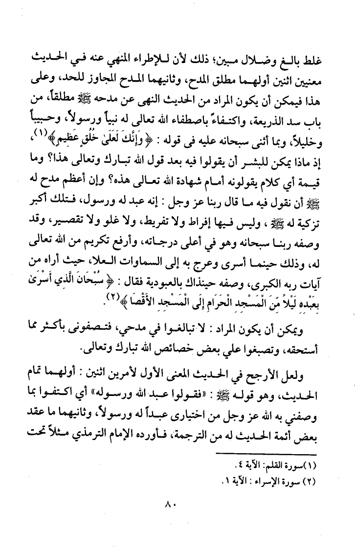 غلط بالغ وضلال مبين، ذلك لأن للاطراء المنهي عنه في الحديث معنيين اثنين أولهما مطلق المدح، وثانيهما المدح المجاوز للحد. وعلى هذا فيمكن أن يكون المراد الحديث النهي عن مدحه صلى الله عليه وسلم مطلقاً، من باب سد الذريعة، واكتفاءً باصطفاء الله تعالى له نبياً ورسولاً، وحبيباً وخليلاً، ومما أثنى سبحانه عليه في قوله: {وَإِنَّكَ لَعَلَى خُلُقٍ عَظِيمٍ} 1، إذ ماذا يمكن للبشر أن يقولوا فيه بعد قول الله تبارك وتعالى هذا؟ وما قيمة أي كلام يقولونه أمام شهادة الله تعالى هذه؟ وإن أعظم مدح له صلى الله عليه وسلم أن تقول فيه ما قال ربنا عز وجل: إنه عبد له ورسوله، فتلك أكبر تزكية له صلى الله عليه وسلم، وليس فيها إفراط ولا تفريط، ولا غلو ولا تقصير. وقد وصفه ربنا سبحانه وتعالى وهو في أعلى درجاته، وأرفع تكريم من الله تعالى له، وذلك حينما أسرى وعرج به إلى السماوات العلى، حيث أراه من آيات ربه الكبرى، وصفه حينذاك بالعبودية فقال: {سُبْحَانَ الَّذِي أَسْرَى بِعَبْدِهِ لَيْلاً مِنَ الْمَسْجِدِ الْحَرَامِ إِلَى الْمَسْجِدِ الْأَقْصَى} 2.