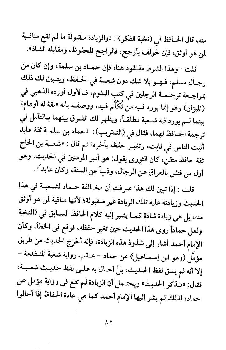قلت: وهذا الشرط مفقود هنا، فإن حماد بن سلمة، وإن كان من رجال مسلم، فهو بلا شك دون شعبة في الحفظ، ويتبين لك ذلك بمراجعة ترجمة الرجلين في كتب القوم، فالأول أورده الذهبي في "الميزان" وهو إنما يورد فيه من تُكُلَّم فيه، ووصفه بأنه "ثقة له أوهام" بينما لم يورد فيه شعبة مطلقاً، ويظهر لك الفرق بينهما بالتأمل في ترجمة الحافظ لهما، فقد قال في "التقريب": حماد بن سلمة ثقة عابد أثبت الناس في ثابت، وتغير حفظه بآخره ثم قال: شعبة بن الحجاج ثقة حافظ متقن، كان الثوري يقول: هو أمير المؤمنين في الحديث، وهو أول من فتش بالعراق عن الرجال، وذب عن السنة، وكان عابداً.