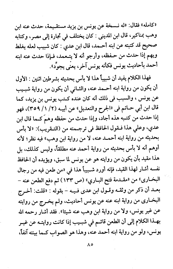 فهذا الكلام يفيد أن شبيباً هذا لا بأس بحديثه بشرطين اثنين: الأول: ان يكون من رواية ابنه أحمد عنه، والثاني: أن يكون من رواية شبيب عن يونس، والسبب في ذلك أنه كان عنده كتب يونس بن يزيد، كما قال ابن أبي حاتم في "الجرح والتعديل" عن أبيه "2/1/359"، فهو إذا حدث من كتبه هذه أجاد، وإذا حدث من حفظه وهو كما قال ابن عدي، وعلى هذا فقول الحافظ في ترجمته من "التقريب": لا بأس بحديثه من رواية ابنه أحمد عنه، لا من رواية ابن وهب فيه نظر، لأنه أوهم أنه لا بأس بحديثه من رواية أحمد مطلقاً، وليس كذلك، بل هذا مقيد بأن يكون من روايته هو عن يونس لما سبق، ويؤيده أن الحافظ نفسه أشار لهذا القيد، فإنه أورد شبيباً هذا في من طعن فيه من رجال البخاري من "مقدمة فتح الباري" "ص133" ثم دفع الطعن عنه – بعد أن ذكر من وثقه وقول ابن عدي فيه – بقوله: "قلت: أخرج البخاري من رواية ابنه عنه عن يونس أحاديث، ولم يخرج من روايته عن غير يونس، ولا من رواية ابن وهب عنه شيئاً. فقد أشار رحمه الله بهذا الكلام إلى أن الطعن قائم في شبيب إذا كانت روايته عن غير يونس، ولو من رواية ابنه أحمد عنه، وهذا هو الصواب كما بينته آنفاً،