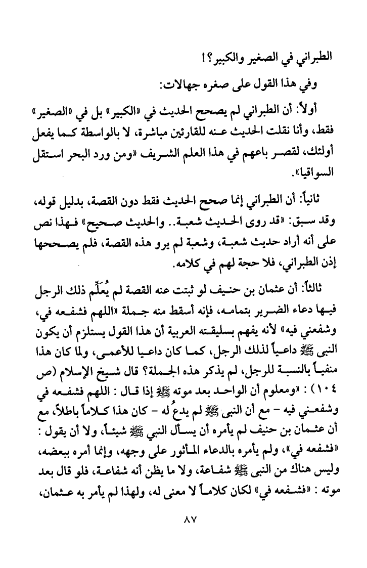 ثالتاً: أن عثمان بن حنيف لو ثبتت عنه القصة لم يُعَلَّم ذلك الرجل فيها دعاء الضرير بتمامه، فإنه أسقط منه جملة "اللهم شفعه في وشفعني فيه" لأنه يفهم بسليقته العربية أن هذا القول يستلزم أن يكون النبي صلى الله عليه وسلم داعياً لذلك الرجل، كما كان داعياً للأعمى، ولما كان هذا منفياً بالنسبة للرجل، لم يذكر هذه الجملة؟ قال شيخ الإسلام "ص104": "ومعلوم أن الواحد بعد موته صلى الله عليه وسلم إذا قال: "اللهم فشفعه في وشفعني فيه" – مع أن النبي صلى الله عليه وسلم لم يدعُ له – كان هذا كلاماً باطلاً، مع أن عثمان بن حنيف لم يأمره ان يسأل النبي صلى الله عليه وسلم شيئاً، ولا أن يقول: "فشفعه في"، ولم يأمره بالدعاء المأثور على وجهه، وإنما أمره ببعضه، وليس هناك من النبي صلى الله عليه وسلم شفاعة، ولا ما يظن أنه شفاعة، فلو قال بعد موته: "فشفعه في" لكان كلاماً لا معنى له، ولهذا لم يأمر به عثمان،