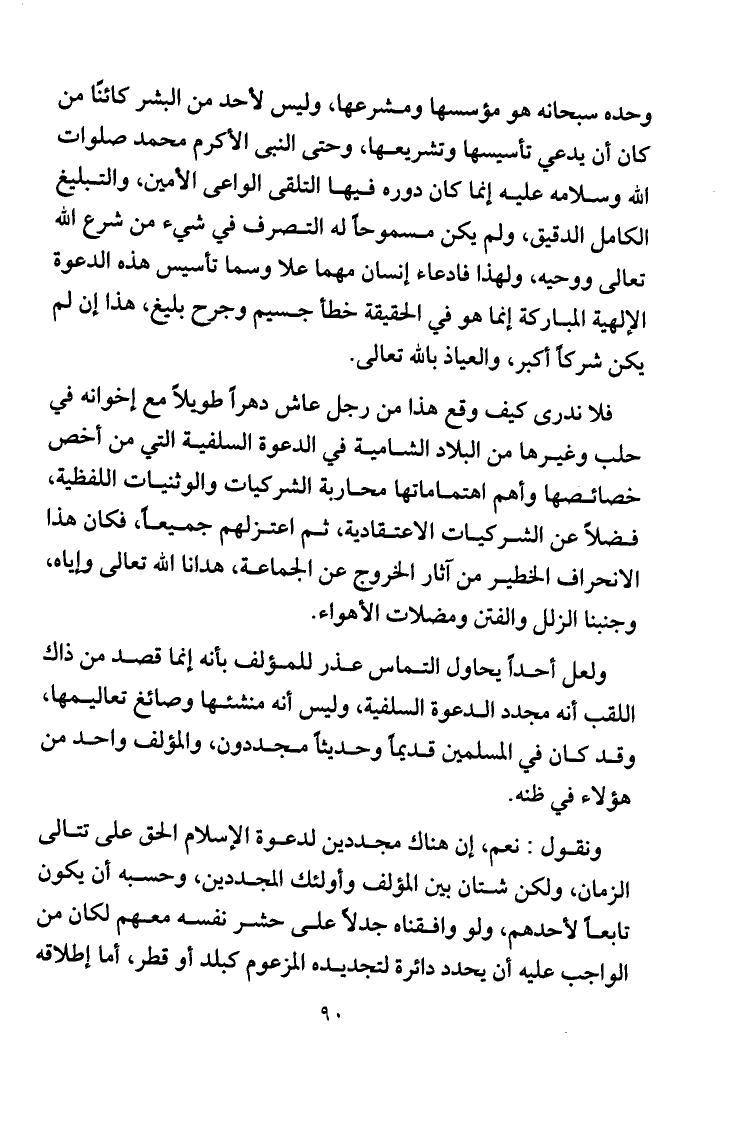 ولعل أحداً يحاول التماس عذر للمؤلف بأنه إنما قصد من ذاك اللقب أنه مجدد الدعوة السلفية، وليس أنه منشئها وصائغ تعاليمها، وقد كان في المسلمين قديماً وحديثاً مجددون، والمؤلف واحد من هؤلاء في ظنه.