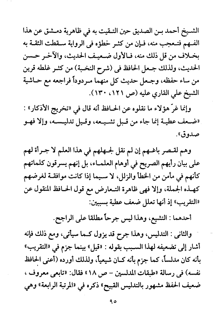 الشيخ أحمد بن الصديق حين التقيت به في ظاهرية دمشق عن هذا الفهم فتعجب منه، فإن من كثر خطؤه في الرواية سقطت الثقة به بخلاف من قال ذلك منه، فالأول ضعيف الحديث، والآخر حسن الحديث، ولذلك جعل الحافظ في "شرح النخبة" من كثر غلطه قرين من ساء حفظه، وجعل حديث كل منهما مردوداً فراجعه مع حاشية الشيخ علي القاري عليه "ص121، 130".