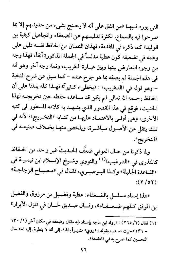 التي يورد فيها من اتفق على أنه لا يحتج بشيء من حديثهم إلا بما صرحوا فيه بالسماع، لكثرة تدليسهم عن الضعفاء والمجاهيل كبقية بن الوليد كما ذكره في المقدمة، فهذان النصان من الحافظ نفسه دليل على وهمه في تضعيفه كون عطية مدلساً في الجملة المذكورة آنفاً. فهذا وجه من وجوه التعارض بينها وبين عبارة "التقريب". وثمة وجه آخر وهو أنه في هذه الجملة لم يصفه بما هو جرح عنده – كما سبق عن "شرح النخبة" – وهو قوله في "التقريب": يخطىء كثيراً فهذا كله يدلنا على أن الحافظ رحمه الله تعالى لم يكن قد ساعده حفظه حين تخريجه لهذا الحديث، فوقع في هذا القصور الذي يشهد به كلامه المسطور في كتبه الأخرى، وهي أولى بالاعتماد عليها من كتابه "التخريج"، لأنه في تلك ينقل عن الأصول مباشرة، ويلخص منها بخلاف صنيعه في "التخريج".