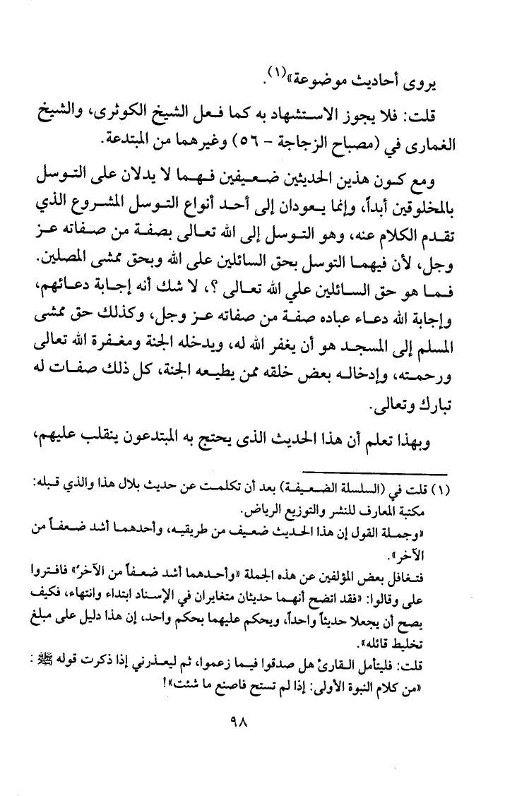 ومع كون هذين الحديثين ضعيفين فهما لا يدلان على التوسل بالمخلوقين أبداً، وإنما يعودان إلى أحد أنواع التوسل المشروع الذي تقدم الكلام عنه، وهو التوسل إلى الله تعالى بصفة من صفاته عز وجل، لأن فيهما التوسل بحق السائلين على الله وبحق ممشى المصلين. فما هو حق السائلين على الله تعالى؟، لا شك أنه إجابة دعائهم، وإجابة الله دعاء عباده صفة من صفاته عز وجل، وكذلك حق ممشى المسلم إلى المسجد هو أن يغفر الله له، ويدخله الجنة ومغفرة الله تعالى ورحمته، وإدخاله بعض خلقه ممن يطيعه الجنة. كل ذلك صفات له تبارك وتعالى.