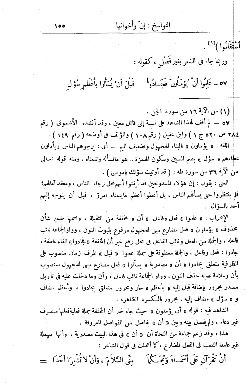 وحرف النَّفْي نَحْو أَفلا يرَوْنَ أَن لَا يرجع إِلَيْهِم قولا وَلَو نَحْو وَأَن لَو استقاموا وَرُبمَا جَاءَ فِي الشّعْر بِغَيْر فصل كَقَوْلِه علمُوا أَن يؤملون فجادوا قبل أَن يسْأَلُوا بأعظم سؤل