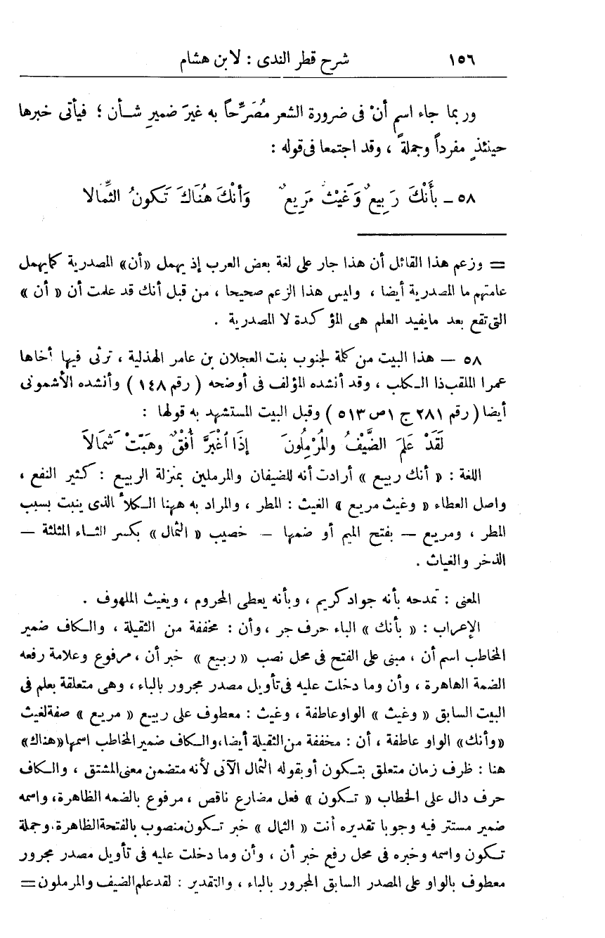 وَرُبمَا جَاءَ اسْم أَن فِي ضَرُورَة الشّعْر مُصَرحًا بِهِ غير ضمير شَأْن فَيَأْتِي خَبَرهَا حِينَئِذٍ مُفردا وَجُمْلَة وَقد اجْتمعَا فِي قَوْله بأنك ربيع وغيث مربع وَأَنَّك هُنَاكَ تكون الثمالا