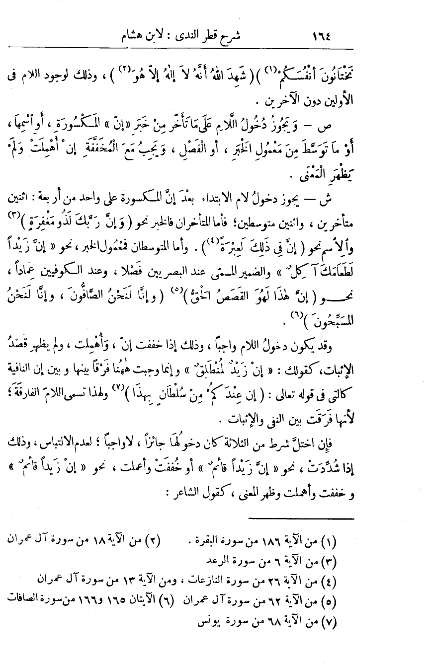 وَإِن كَانَت قد فتحت بعد علم وَشهد فِي قَوْله تَعَالَى علم الله أَنكُمْ كُنْتُم تختانون أَنفسكُم شهد الله أَنه لَا إِلَه الا هُوَ وَذَلِكَ لوُجُود اللَّام فِي الْأَوَّلين دون الآخرين ص وَيجوز دُخُول اللَّام على مَا تَأَخّر من خبر ان الْمَكْسُورَة أَو اسْمهَا أَو مَا توَسط من مَعْمُول الْخَبَر أَو الْفَصْل وَيجب مَعَ المخففة إِن أهملت وَلم يظْهر الْمَعْنى ش يجوز دُخُول لَام الِابْتِدَاء بعد إِن الْمَكْسُورَة على وَاحِد من أَرْبَعَة اثْنَيْنِ متأخرين واثنين متوسطين فَأَما المتأخران فَالْخَبَر نَحْو وَإِن رَبك لذُو مغْفرَة وَالِاسْم نَحْو إِن فِي ذَلِك لعبرة وَأما المتوسطان فمعمول الْخَبَر نَحْو إِن زيدا لطعامك آكل وَالضَّمِير الْمُسَمّى عِنْد الْبَصرِيين فصلا وَعند الكوفين عمادا نَحْو إِن هَذَا لَهو الْقَصَص الْحق وَإِنَّا لنَحْنُ الصافون وَإِنَّا لنَحْنُ المسبحون وَقد يكون دُخُول اللَّام وَاجِبا وَذَلِكَ اذا خففت وأهملت وَلم يظْهر قصد الاثبات كَقَوْلِك ان زيد لمنطلق وَإِنَّمَا وَجَبت هَهُنَا فرقا بَينهَا وَبَين ان النافية كَالَّتِي فِي قَوْله تَعَالَى ان عِنْد كم من سُلْطَان بِهَذِهِ وَلِهَذَا تسمى اللَّام الفارقة لِأَنَّهَا فرقت بَين النَّفْي والاثبات فان اخْتَلَّ شَرط من الثَّلَاثَة كَانَ دُخُولهَا جَائِزا لَا وَاجِبا لعدم الالتباس وَذَلِكَ اذا سددت نَحْو ان زيدا قَائِم أَو خففت وأعملت نَحْو ان زيدا قَائِم أَو خففت وأهملت وَظهر الْمَعْنى كَقَوْل الشَّاعِر