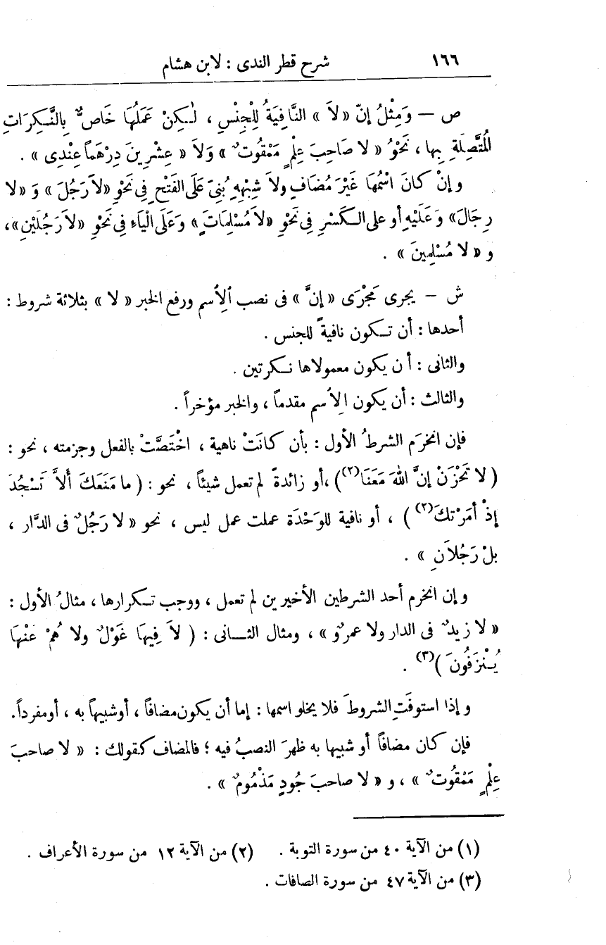 ص وَمثل ان لَا النافية للْجِنْس لَكِن عَملهَا خَاص بالنكرات الْمُتَّصِلَة بهَا نَحْو لَا صَاحب علم ممقوت وَلَا عشْرين درهما عِنْدِي وان كَانَ اسْمهَا غير مُضَاف وَلَا شبهه بني على الْفَتْح فِي نَحْو لَا رجل وَلَا رجال وَعَلِيهِ أَو على الْكسر فِي نَحْو لَا مسلمات وعَلى الْيَاء فِي نَحْو لَا رجلَيْنِ وَلَا مُسلمين ش يجْرِي مجْرى ان فِي نصب الِاسْم وَرفع الْخَبَر لَا بِثَلَاثَة شُرُوط أَحدهَا ان يكون نَافِيَة للْجِنْس وَالثَّانِي ان يكون معمولاها لكرتين وَالثَّالِث ان يكون الِاسْم مقدما وَالْخَبَر مُؤَخرا فَإِن انخرم الشَّرْط الأول بِأَن كَانَت ناهية اخْتصّت بِالْفِعْلِ وجزمته نَحْو لَا تحزن ان الله مَعنا أَو زَائِدَة لم تعْمل شَيْئا نَحْو مَا مَنعك أَلا تسْجد إِذْ أَمرتك أَو نَافِيَة للوحدة عملت عمل لَيْسَ نَحْو لَا رجل فِي الدَّار بل رجلَانِ وان انخرم أحد الشَّرْطَيْنِ الْأَخيرينِ لم تعْمل وَوَجَب تكرارها مِثَال الأول لَا زيد فِي الدَّار وَلَا عَمْرو وَمِثَال الثَّانِي لَا فِيهَا غول وَلَا هم عَنْهَا ينزفون وَإِذا استوفت الشُّرُوط فَلَا يخلوا اسْمهَا اما ان يكون مُضَافا أَو شَبِيها بِهِ أَو مُفردا فان كَانَ مُضَافا أَو شَبِيها بِهِ ظهر النصب فِيهِ فالمضاف كَقَوْلِك لَا صَاحب علم ممقوت وَلَا صَاحب جود مَذْمُوم والشبيه بالمضاف مَا اتَّصل بِهِ شَيْء من تَمام مَعْنَاهُ اما مَرْفُوع بِهِ نَحْو لَا قبيحا فعله ممدوح أَو مَنْصُوب بِهِ نَحْو لَا طالعا جبلا حَاضر أَو مخفوض بخافض يتَعَلَّق بِهِ نَحْو لَا خيرا من زيد عندنَا