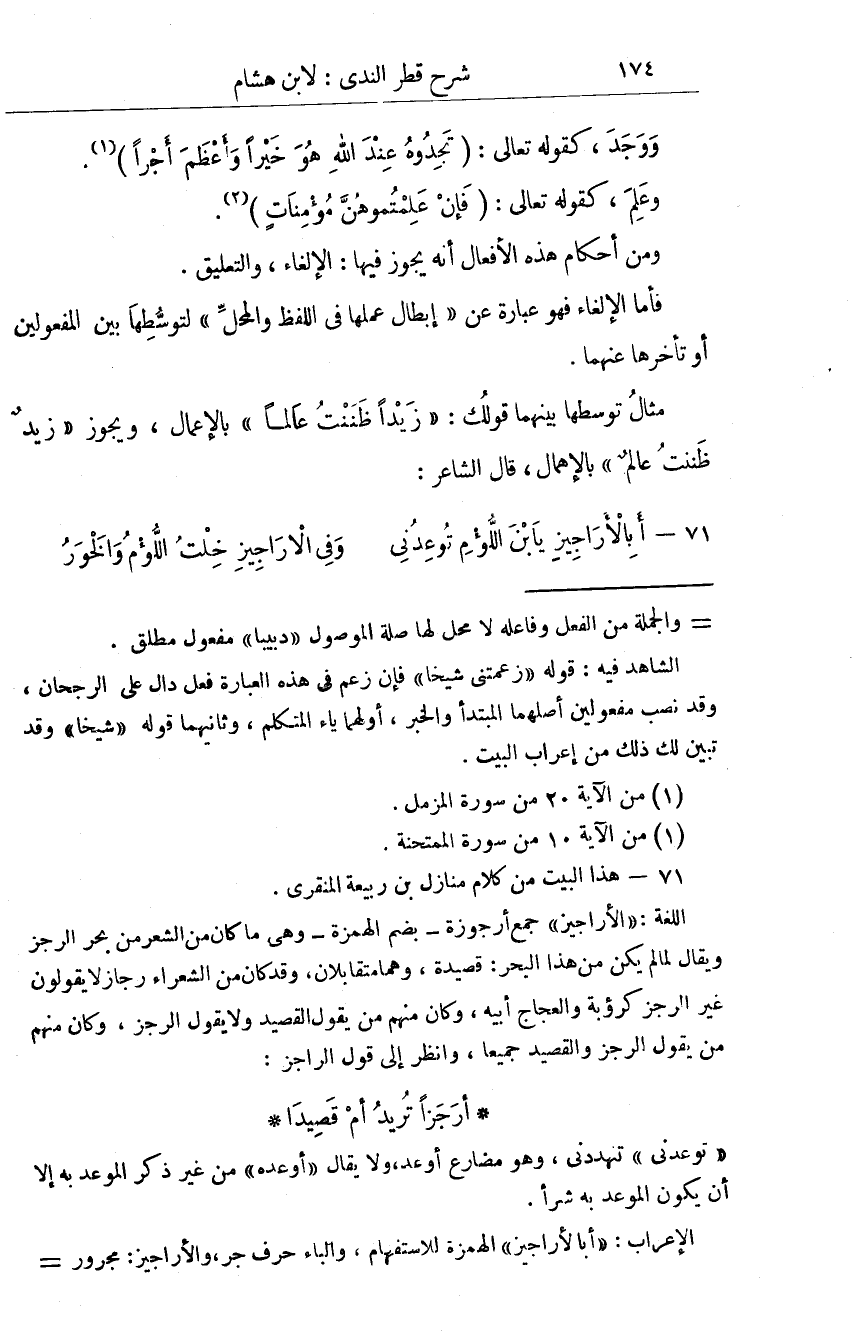 أَبَا الأراجيز يَابْنَ اللؤم توعدني وَفِي الأراجيز خلت اللؤم والخور فاللؤم مُبْتَدأ مُؤخر وَفِي الأراجيز فِي مَوضِع رفع لِأَنَّهُ خبر مقدم وألغيت خلت لتوسطها بَيْنَمَا وَهل للوجهان سَوَاء أَو الإعمال أرجح فِيهِ مذهبان
